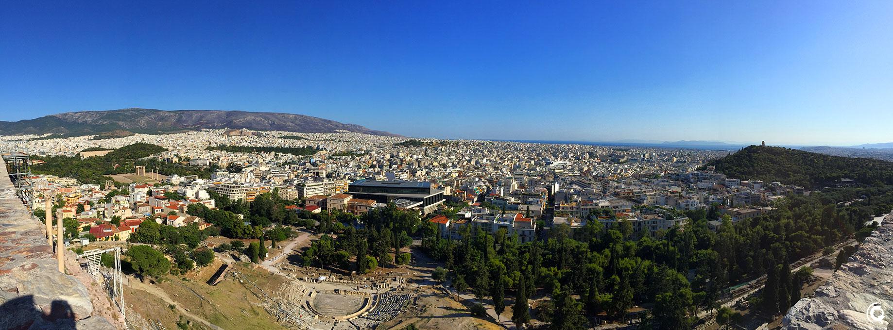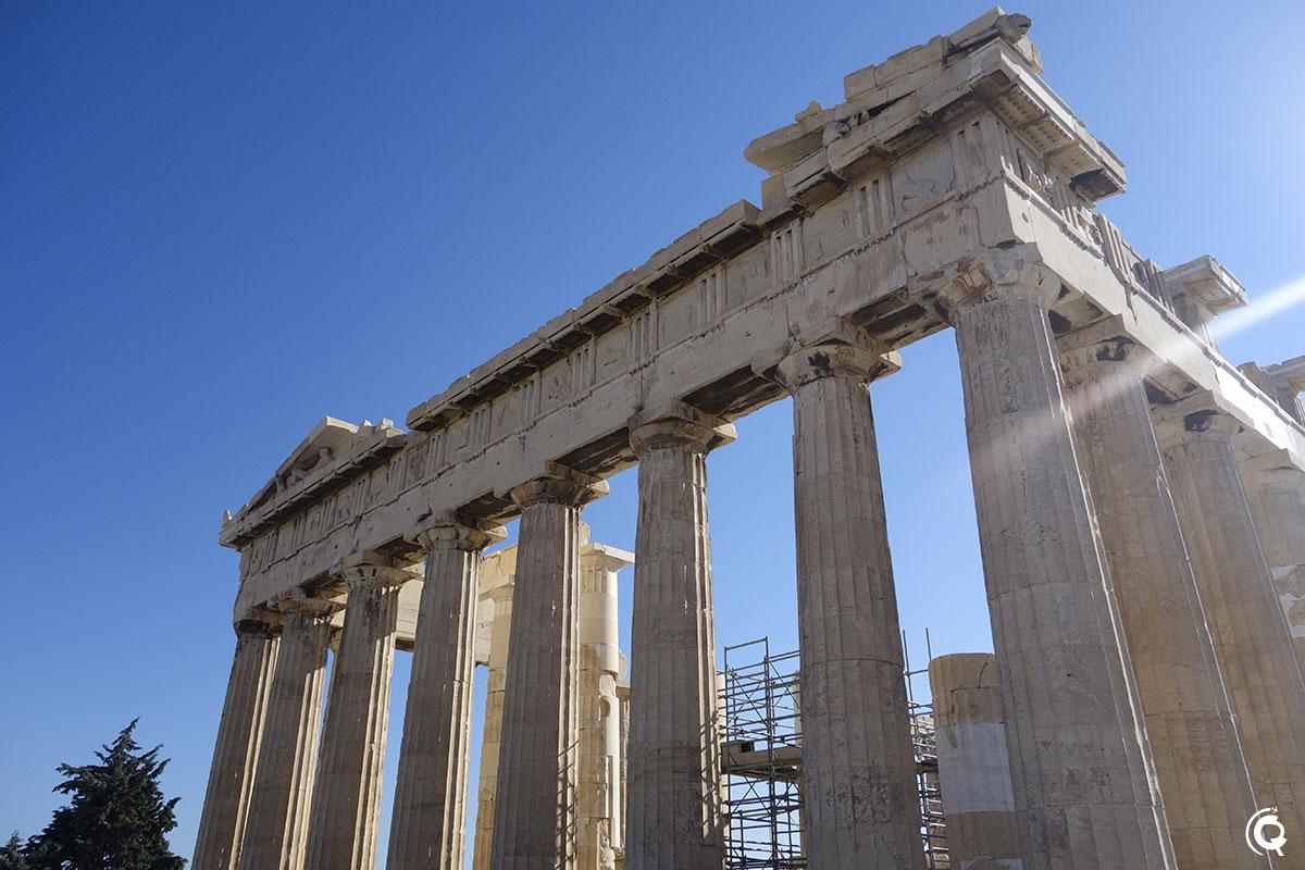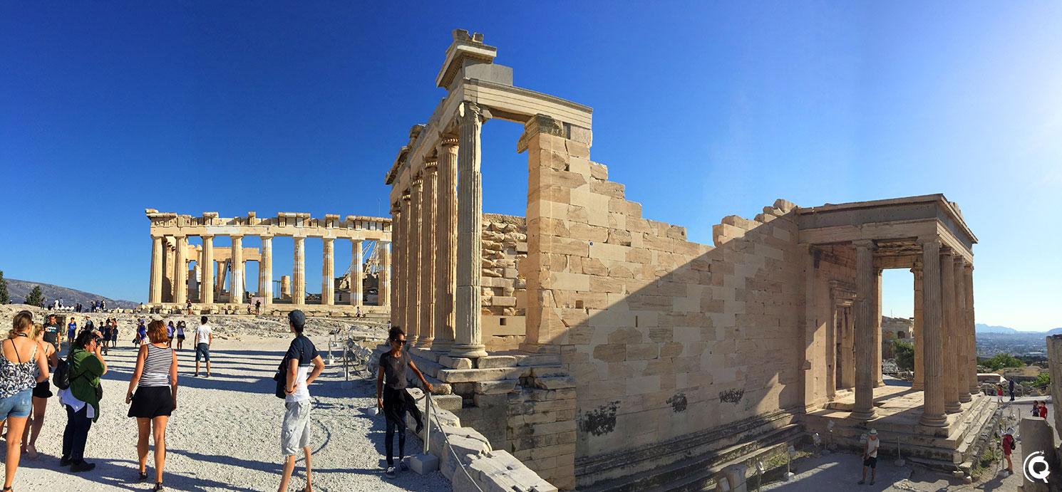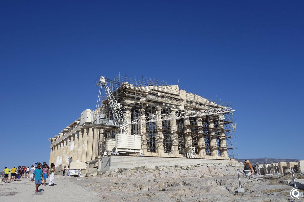 Arrivés en haut, petite déception car le Parthénon est en restauration sur toute la façade avant. Hormis cela, le lieu est extraordinaire, on s’imprègne de la dimension historique des bâtiments. La vue 360° sur Athènes est époustouflante.