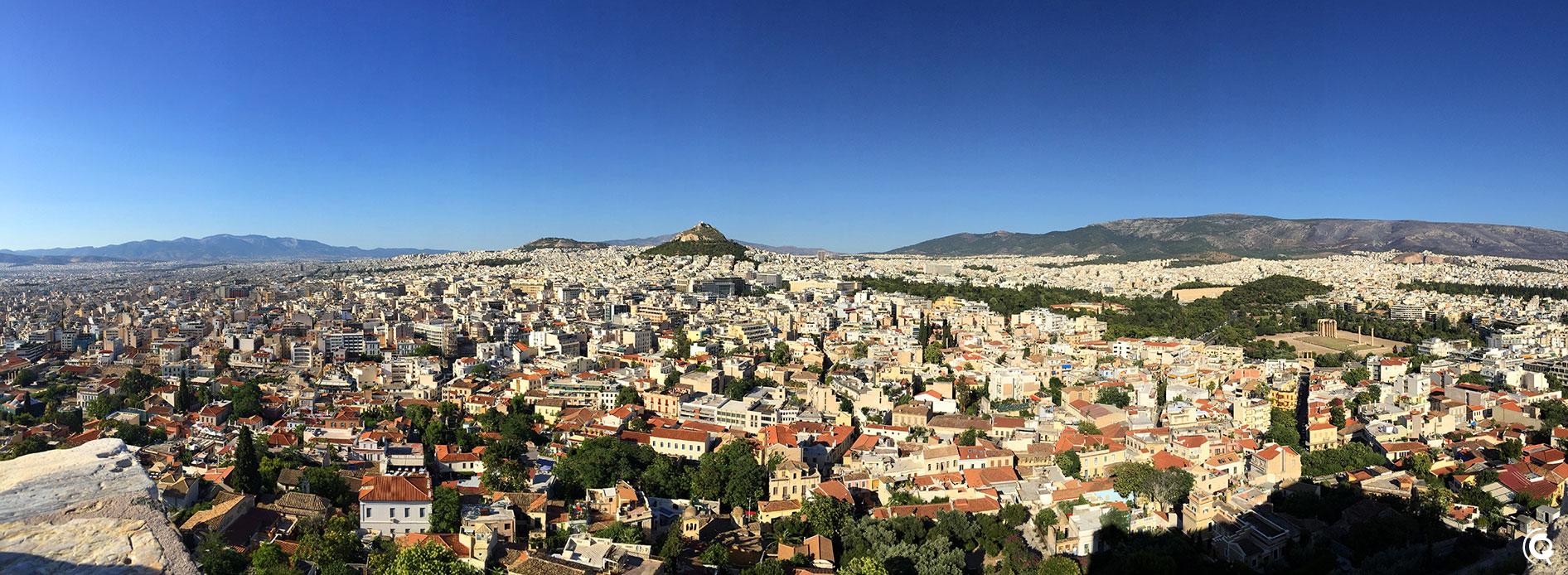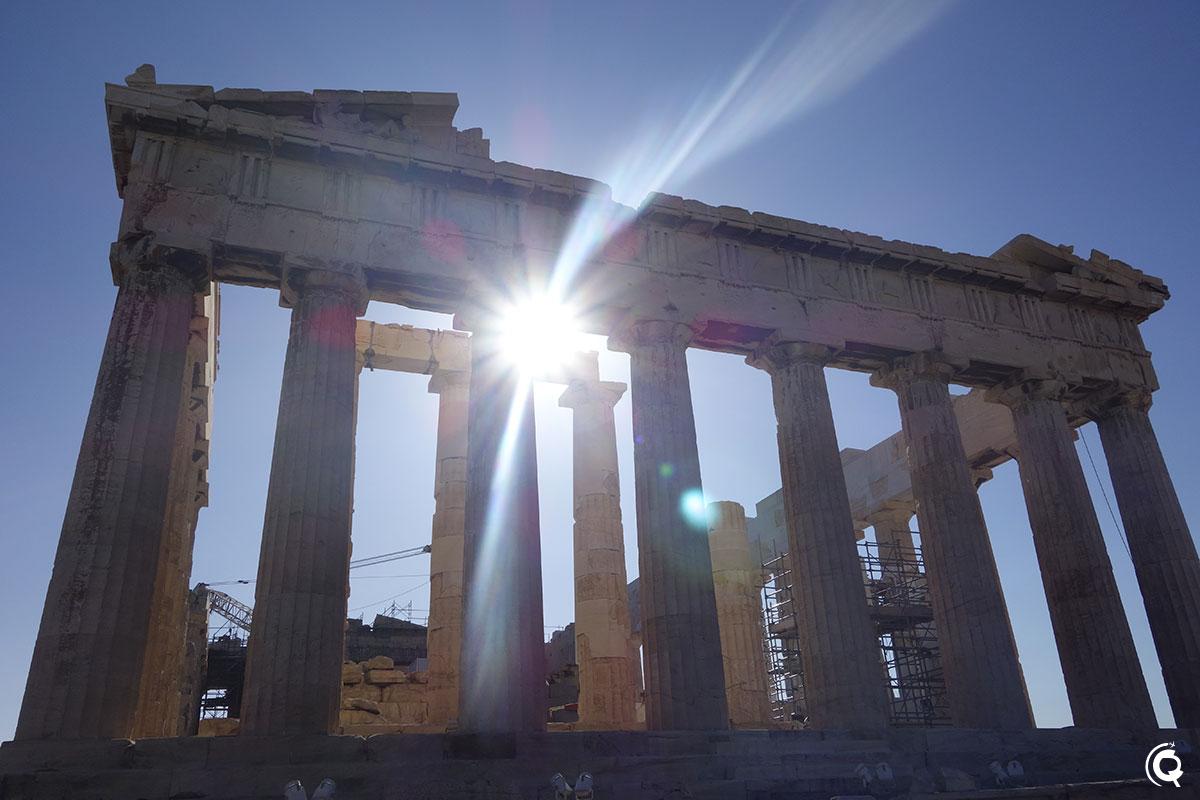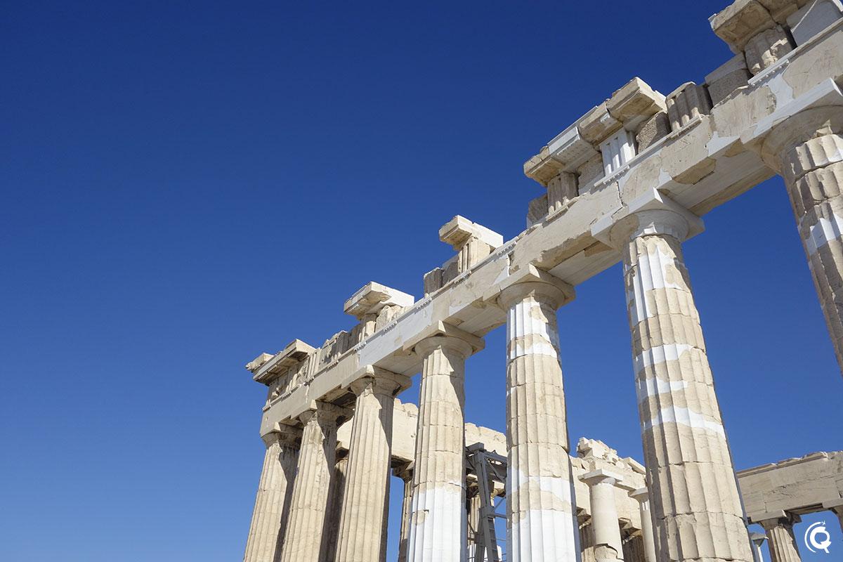 Arrivés en haut, petite déception car le Parthénon est en restauration sur toute la façade avant. Hormis cela, le lieu est extraordinaire, on s’imprègne de la dimension historique des bâtiments. La vue 360° sur Athènes est époustouflante.