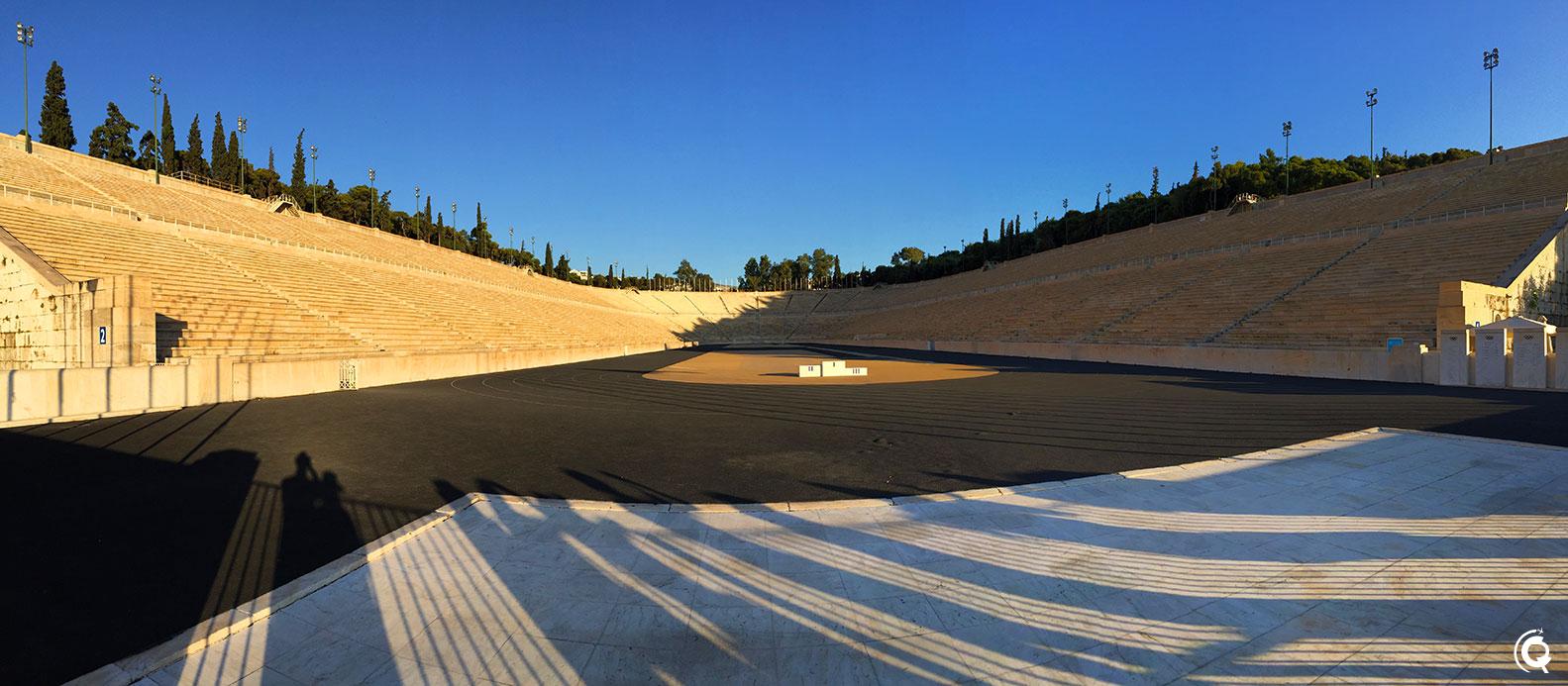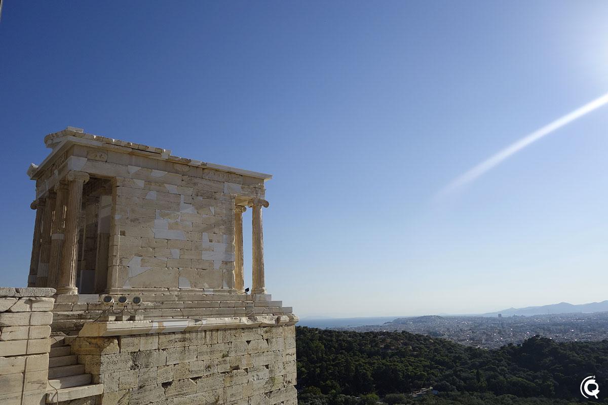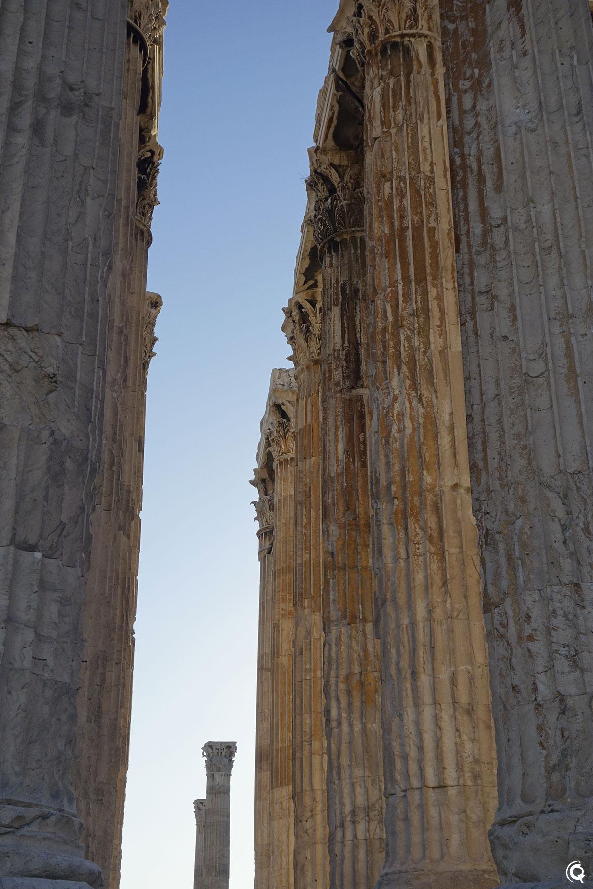Nous commençons l’ascension par le théâtre de Dionysos ou plutôt ce qu’il en reste. Avant d’arriver au temple d’Athéna, nous passons devant l’Odéon d’Hérode Atticus, une sorte d’amphithéâtre aux proportions démesurées avec vue sur Athènes en arrière-plan.