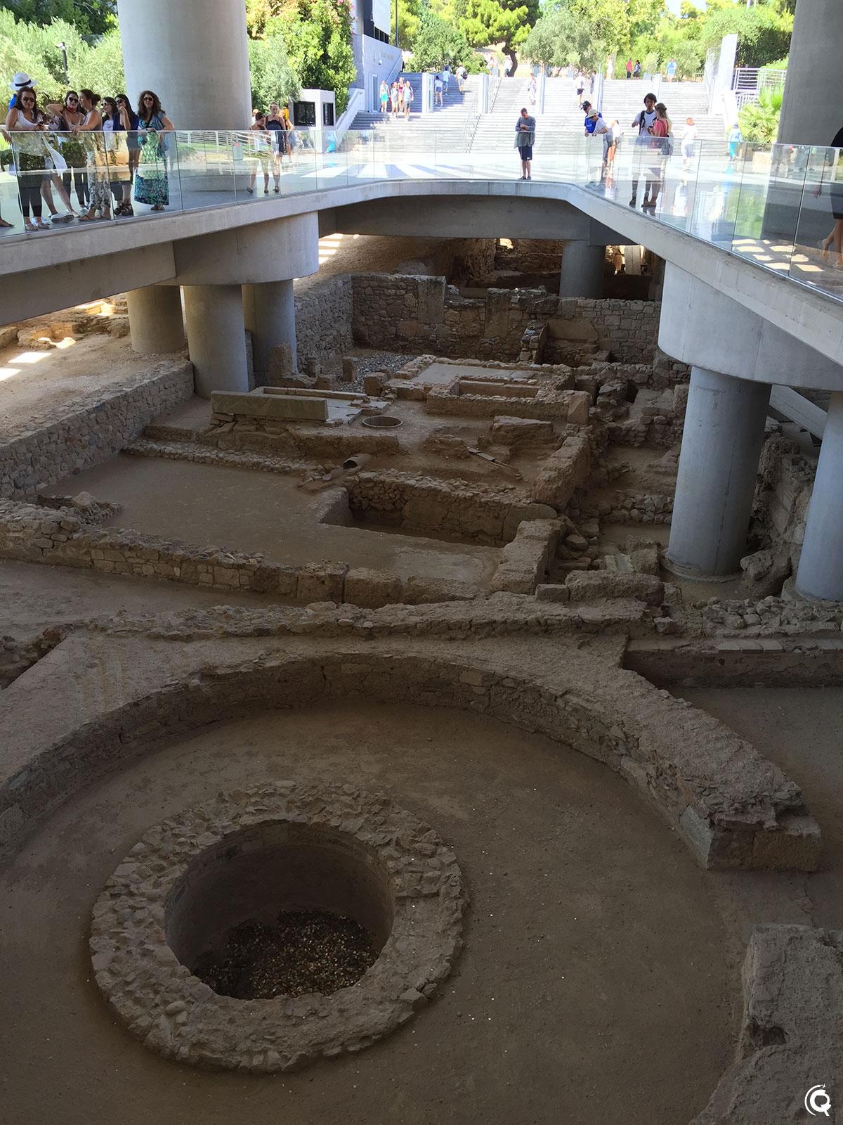 Le lendemain matin, nous visitons le musée de l’Acropole, passage obligé à Athènes. Le musée de l’Acropole est un des plus intéressants qu’il m’ait été donné de visiter. De l’extérieur, le bâtiment est très moderne avec ses grandes baies vitrées. Le dernier étage du musée m’a particulièrement plu puisqu’il a exactement la même orientation que celle du Parthénon. A travers les baies vitrées, on observe l’Acropole. Ce dernier étage reconstitue l’ancienne frise qui ornait la façade du Parthénon. Le seul bémol et c’est comme ça pour plusieurs collections, c’est que de nombreux morceaux manquent cruellement à l’appel. Ils sont détenus par d’autres musées, en particulier le British Museum qui refuse de les céder à la Grèce malgré plusieurs demandes ces dernières années.