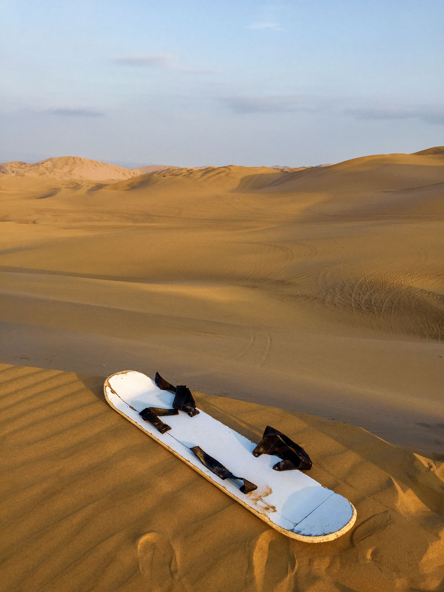 Après plusieurs minutes d’accélérations fulgurantes et de virages à 180°, le chauffeur s’arrête en haut d’une dune afin qu’on s’essaye à l’autre spécialité du coin : le sandboard, ou autrement dit le surf des sables !