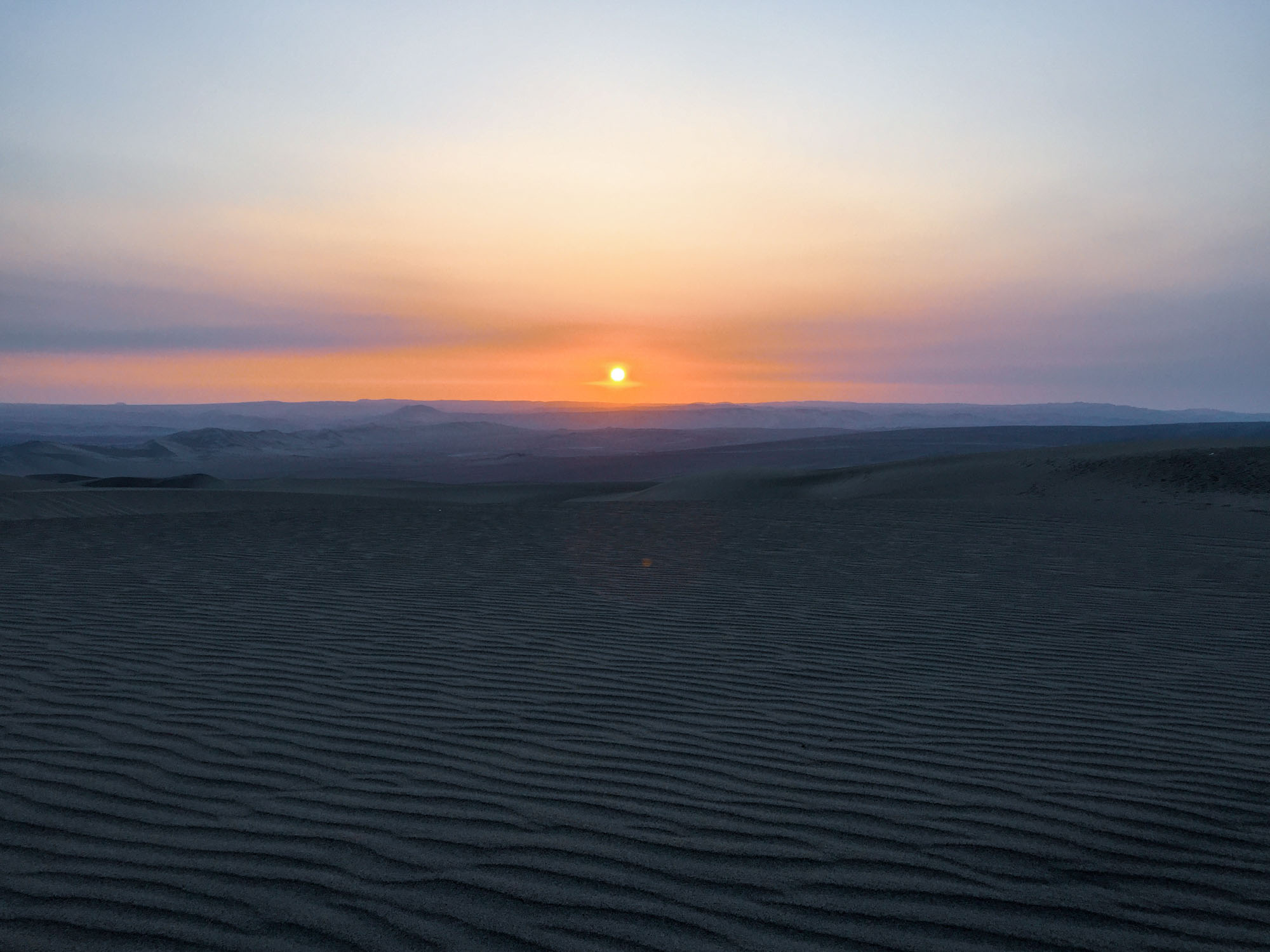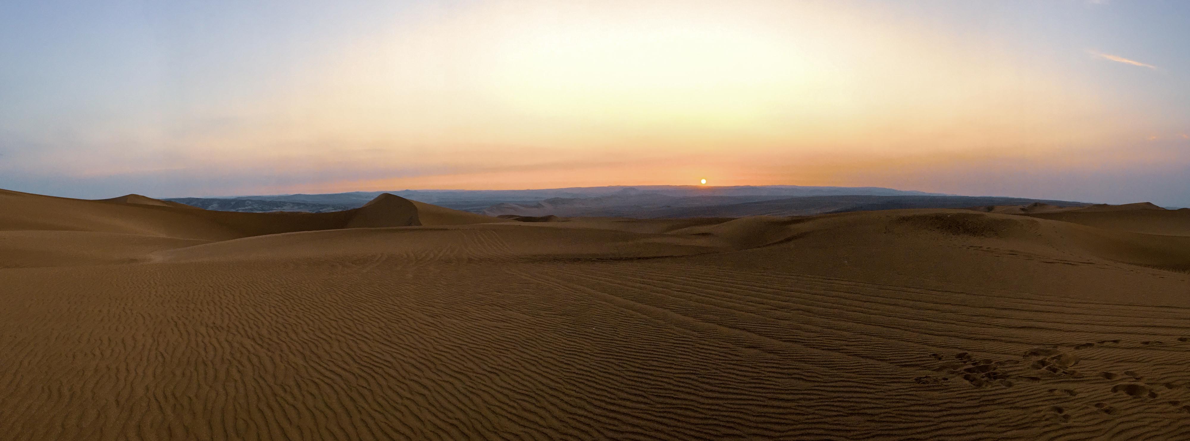 Le soleil se couche lentement sur les dunes qui s’étendent à perte de vue : spectacle magnifique !