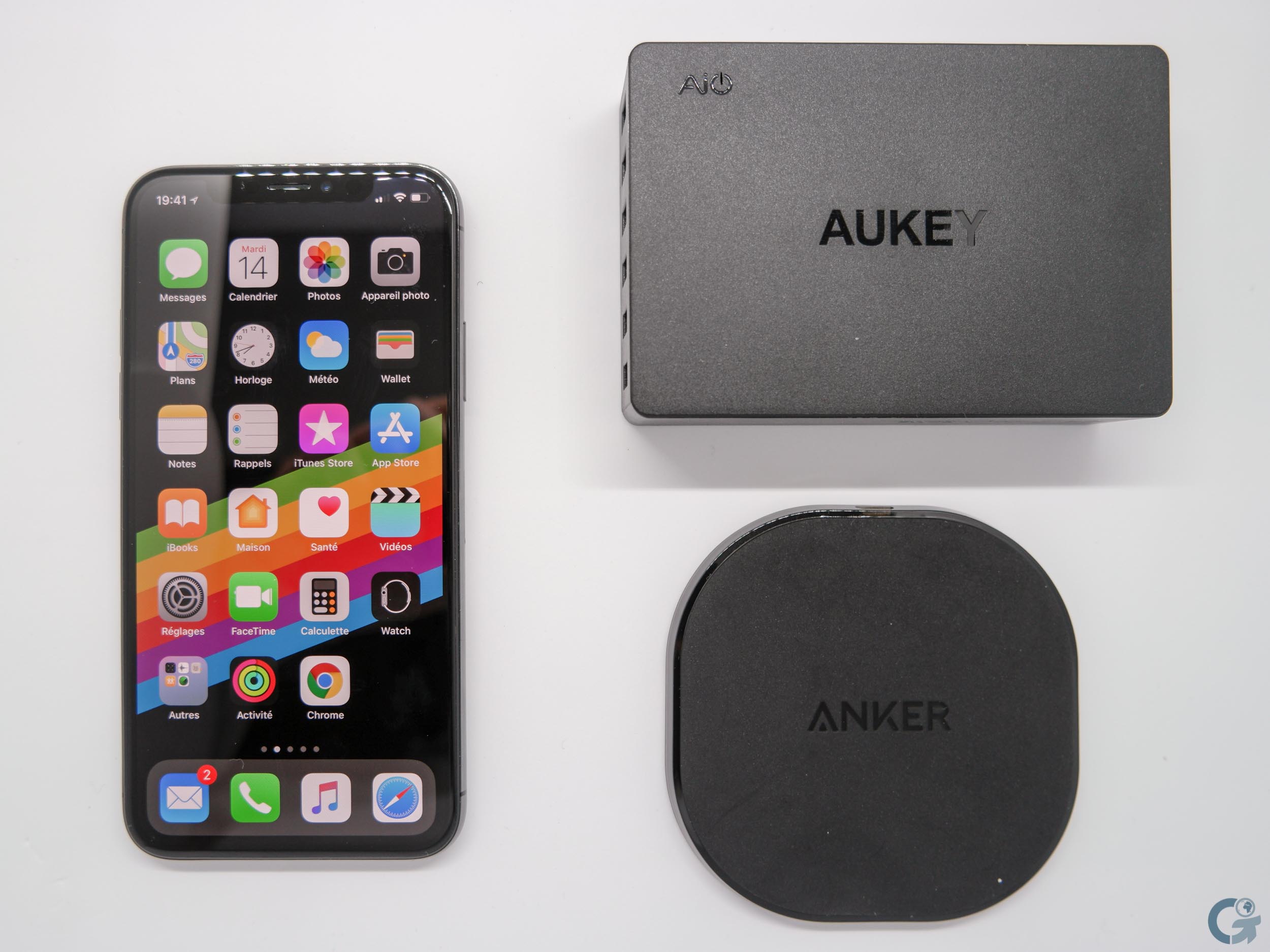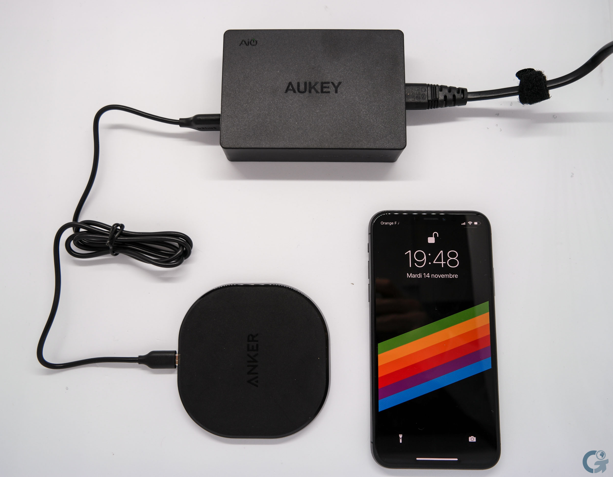 Trouvant la somme exorbitante, j’ai investi dans un chargeur par induction, le Anker Powerport Qi 10 à 17,99€ et dans un chargeur USB secteur, le Aukey PA-T11 à 19,99€, capable de délivrer 60W avec 6 ports dont 2 sont compatibles avec la norme Quick Charge 3.0. Du coup, ça va me servir à brancher tous mes autres appareils en même temps !