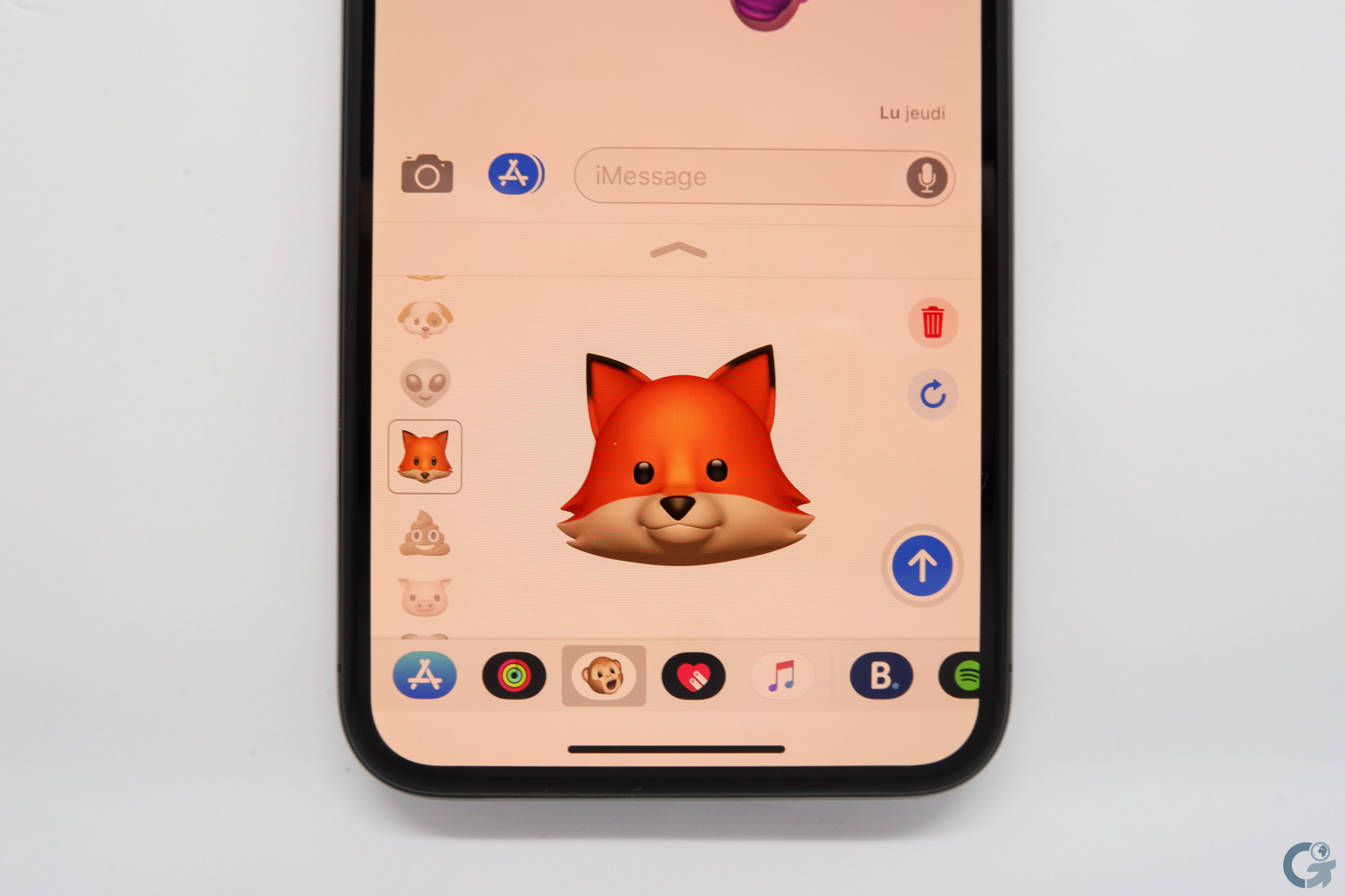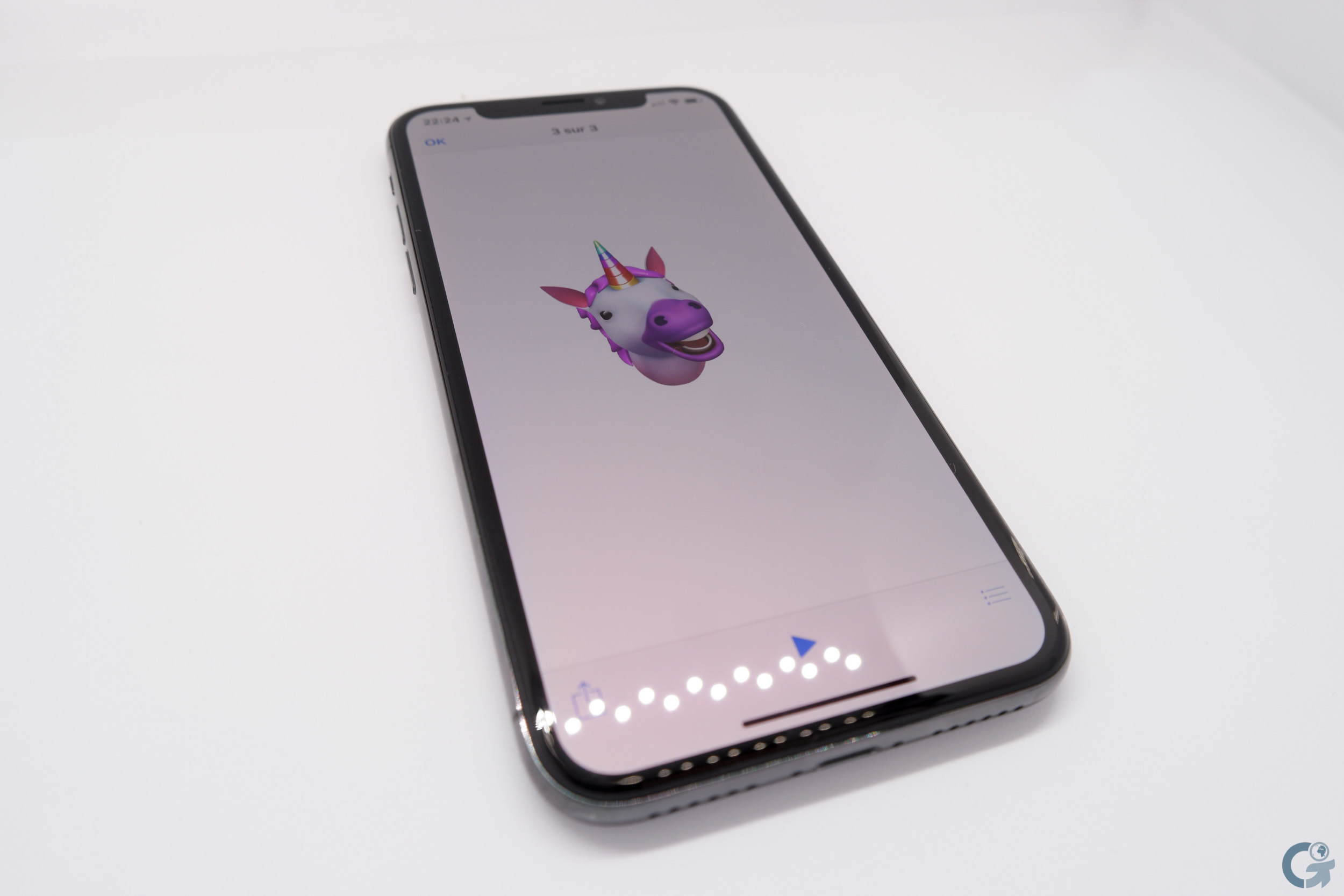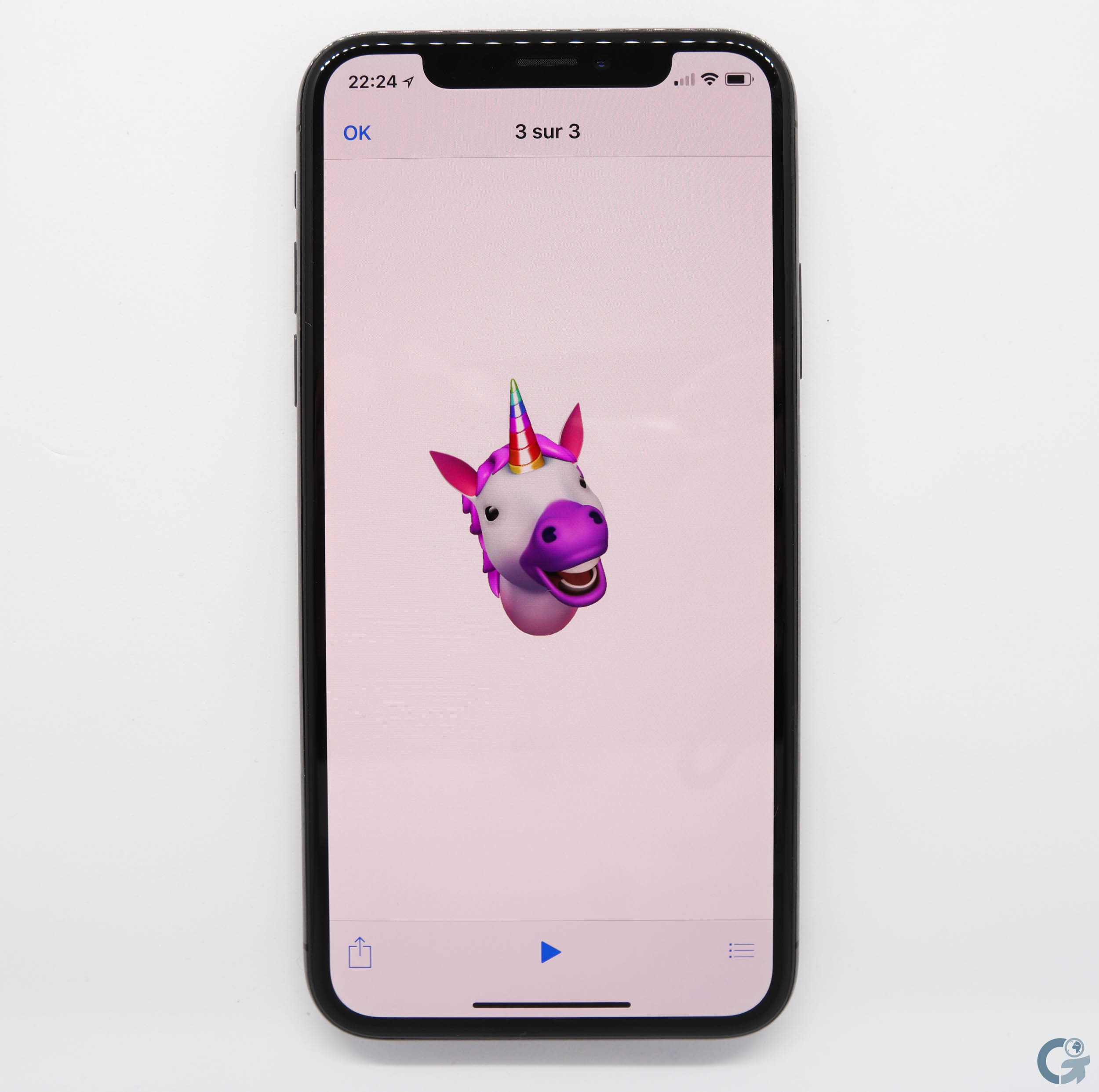 Les Animojis, c’est un peu le gadget qui permet pour Apple de promouvoir le capteur TrueDepth d’une manière trop cool ! Effectivement, c’est un peu gadget mais on se surprend à y jouer plus que de raison avec ces petits émoticônes animés. Les Animojis sont pour l’instant cantonnés à l’application Messages. On peut par contre en envoyant par iMessage mais également aux contacts qui n’ont pas iMessage, ça sera transformé en MMS vidéo et ça c’est plutôt cool ! Le seul petit reproche c’est que les Animojis sont pour l’instant limités à 10 secondes, c’est court surtout quand on veut faire faire un karaoké à notre ami le cochon ! Pour le fonctionnement, il suffit de sélectionner l’émoji qu’on veut animer avec notre visage et d’enregistrer la séquence. Le gros point positif c’est qu’une fois que la séquence est enregistrée, on peut très bien changer de « personnage » après coup, on n’est pas obligé de refaire la séquence pour l’enregistrer ! Le système fonctionne très bien, à part les clins d’oeil par exemple, l’animoji plisse des yeux mais ne le ferme pas. Apple va surement faire évoluer les expressions faciales supportées ainsi que le nombre d’Animojis disponibles dans le futur. Vous pouvez très bien passer le portable à un ami, les Animojis vont s’adapter à lui pour reproduire ses expressions même si j’ai remarqué des fois où ça ne fonctionnait pas très bien.