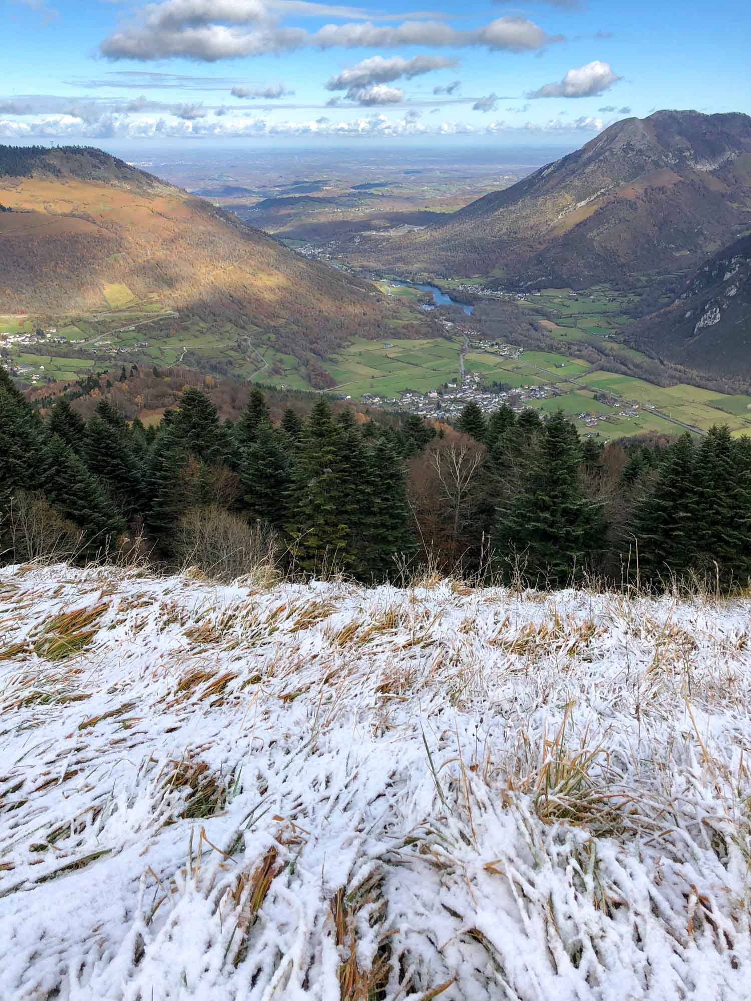 Lors de la descente, on s’éloigne une nouvelle fois du sentier (pas évident la trace) ce qui allonge un peu le parcours. Le temps se dégage et l’on finit la randonnée sous le soleil avec une nouvelle fois, une très belle vue sur la vallée et ses sommets enneigés.