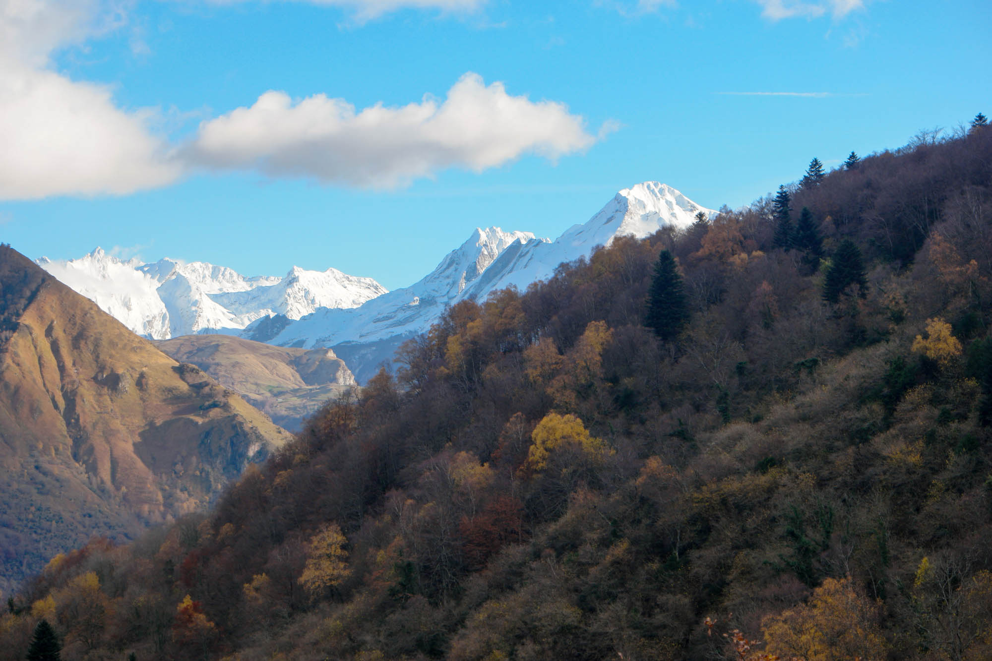 Très vite, le sentier prend de la hauteur et nous permet d’admirer une vue panoramique sur la vallée. Les couleurs automnales sont là, avec ses teintes orangées et ses feuilles au sol. Le contraste apparaît déjà avec les sommets enneigés environnants. À ce moment-là, on ne sait pas encore si l’on va trouver de la neige d’ici au sommet.