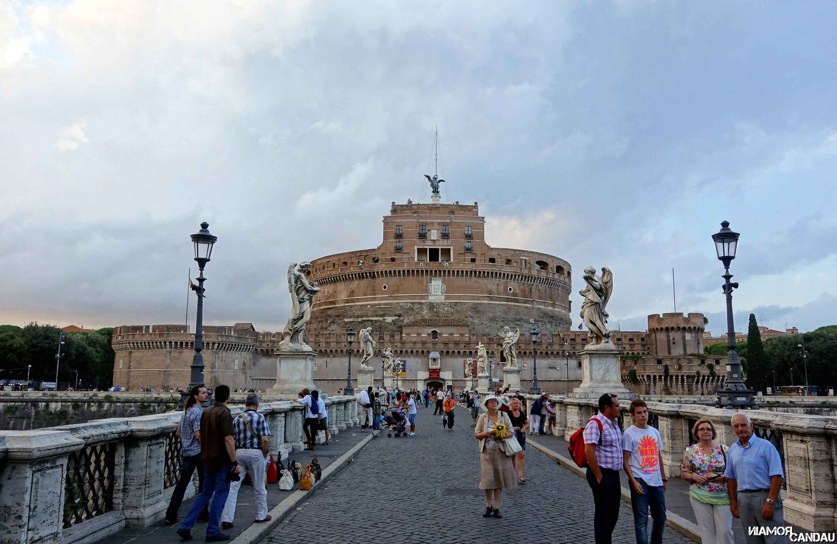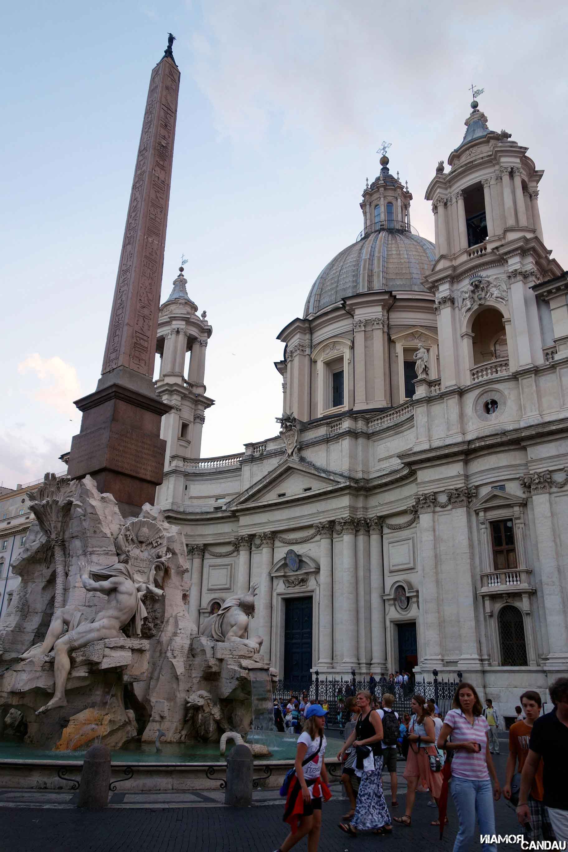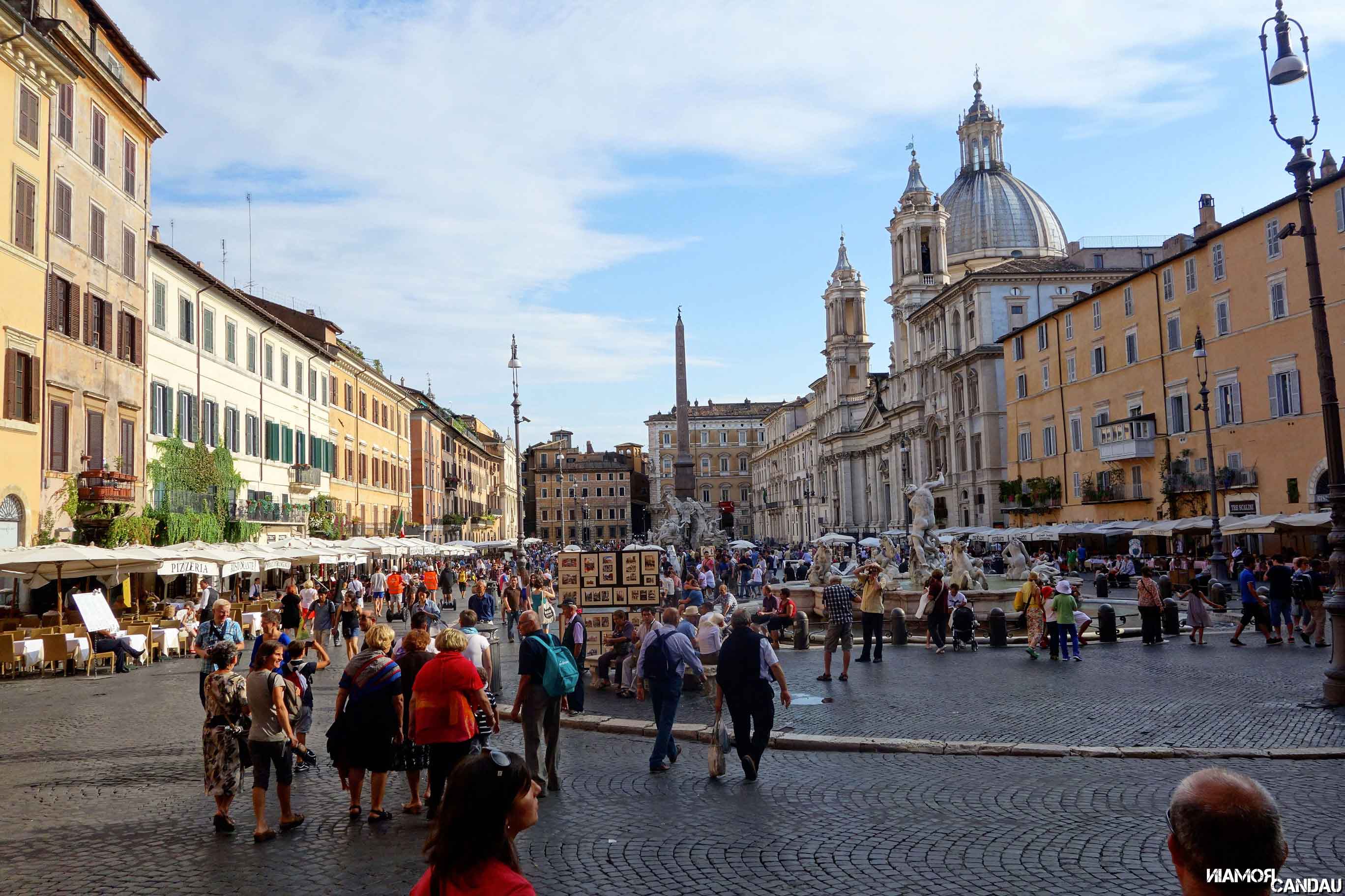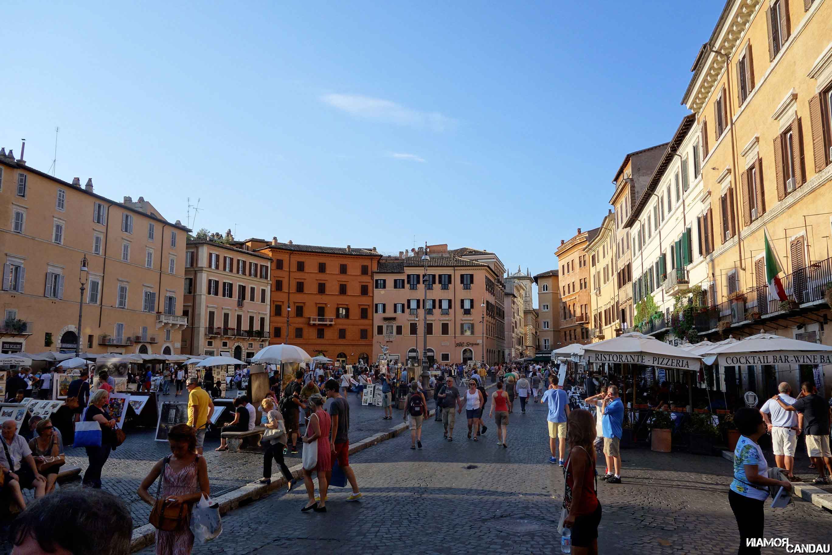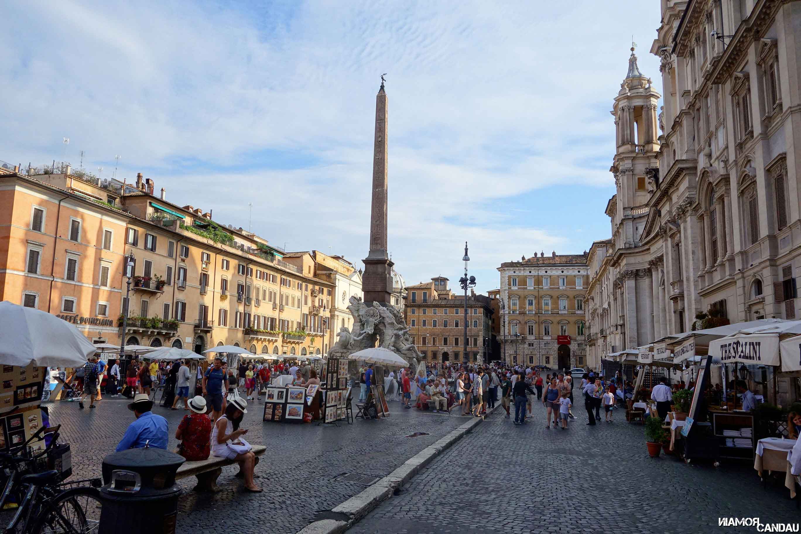 A peine arrivés, nous sommes allés faire un petit tour aux alentours de l’appartement. 10 minutes de marche, et nous arrivons au château Saint Ange et son architecture particulière et surprenante. Il est possible de visiter l’intérieur pour une dizaine d’euros et la vue de là-haut doit être inoubliable. Nous traversons le somptueux pont Saint-Ange avec ses innombrables statues. 5 minutes de marche plus tard, nous arrivons à la Piazza Navona. C’est aussi ça qui fait la force de Rome, il n’y a pas besoin de marcher bien longtemps pour tomber sur quelque chose d’intéressant à voir. Nous avons adoré l’ambiance particulière qui règne sur cette place, mélange de Montmartre parisien pour les artistes présents sur la place, d’Italie méditerranéenne pour les façades colorées et d’architecture baroque pour la fontaine des Quatre-Fleuves et l’église Sainte-Agnès.