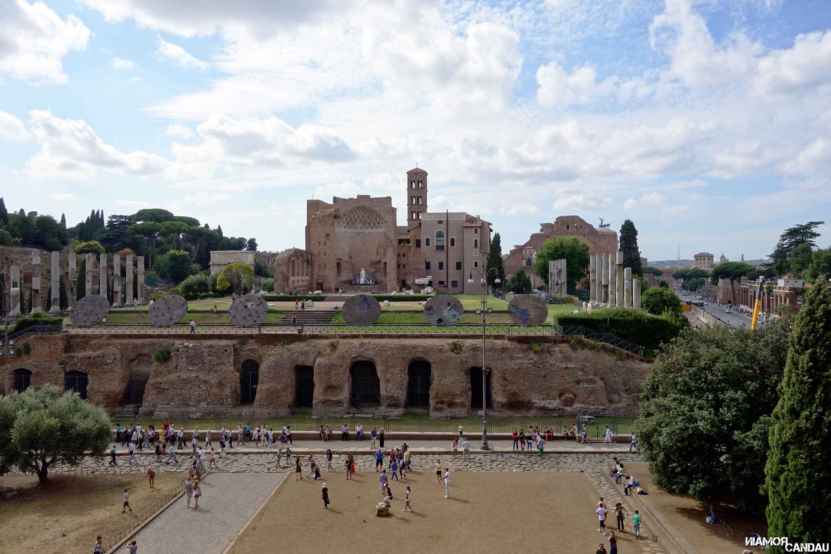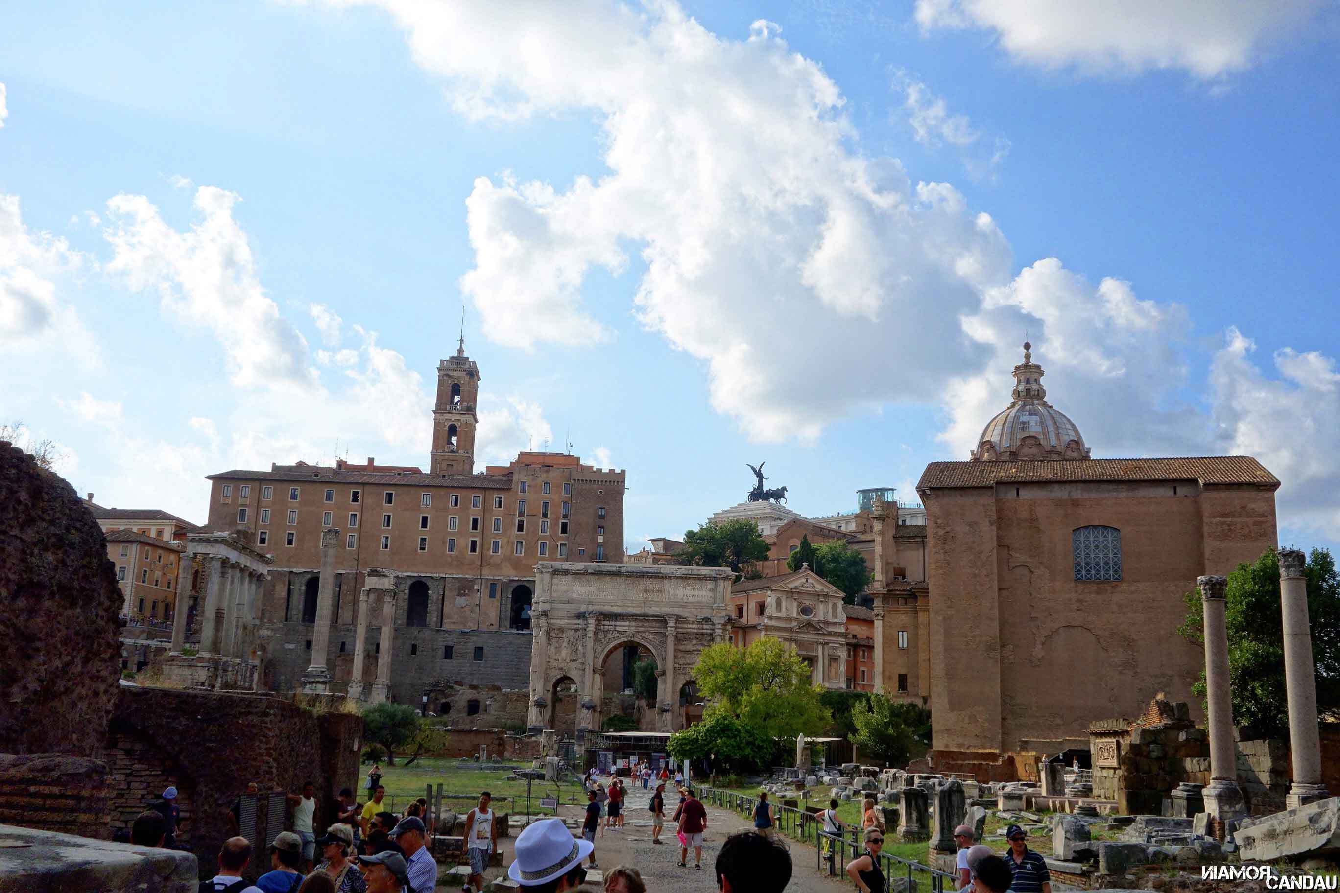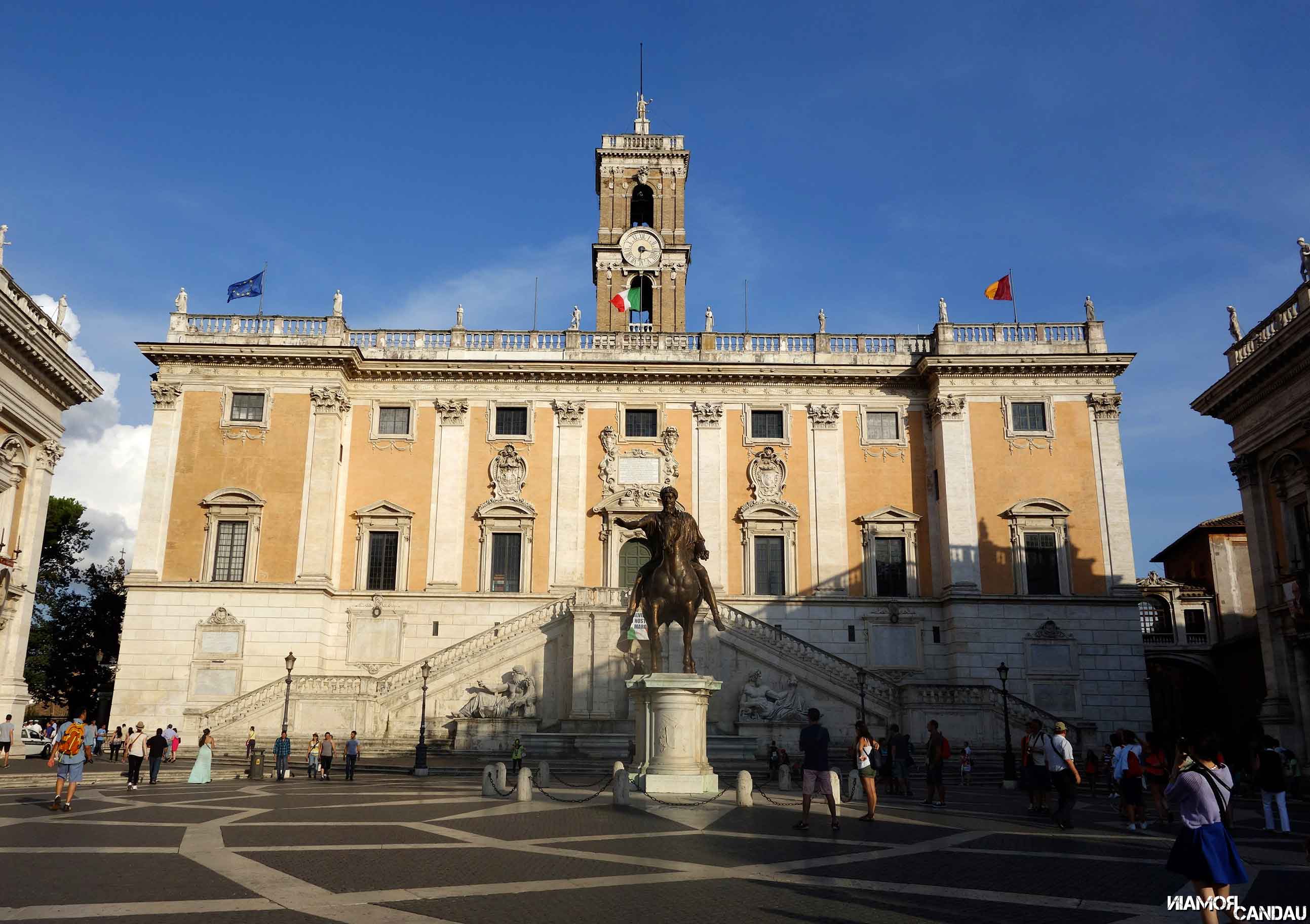 Derrière ce bâtiment, en hauteur, se trouve le Capitole (Campidoglio en VO). Sur la droite du Capitole, une petite rue permet d’accéder à un belvédère qui donne sur le Forum Romain et sur le Colisée au loin.