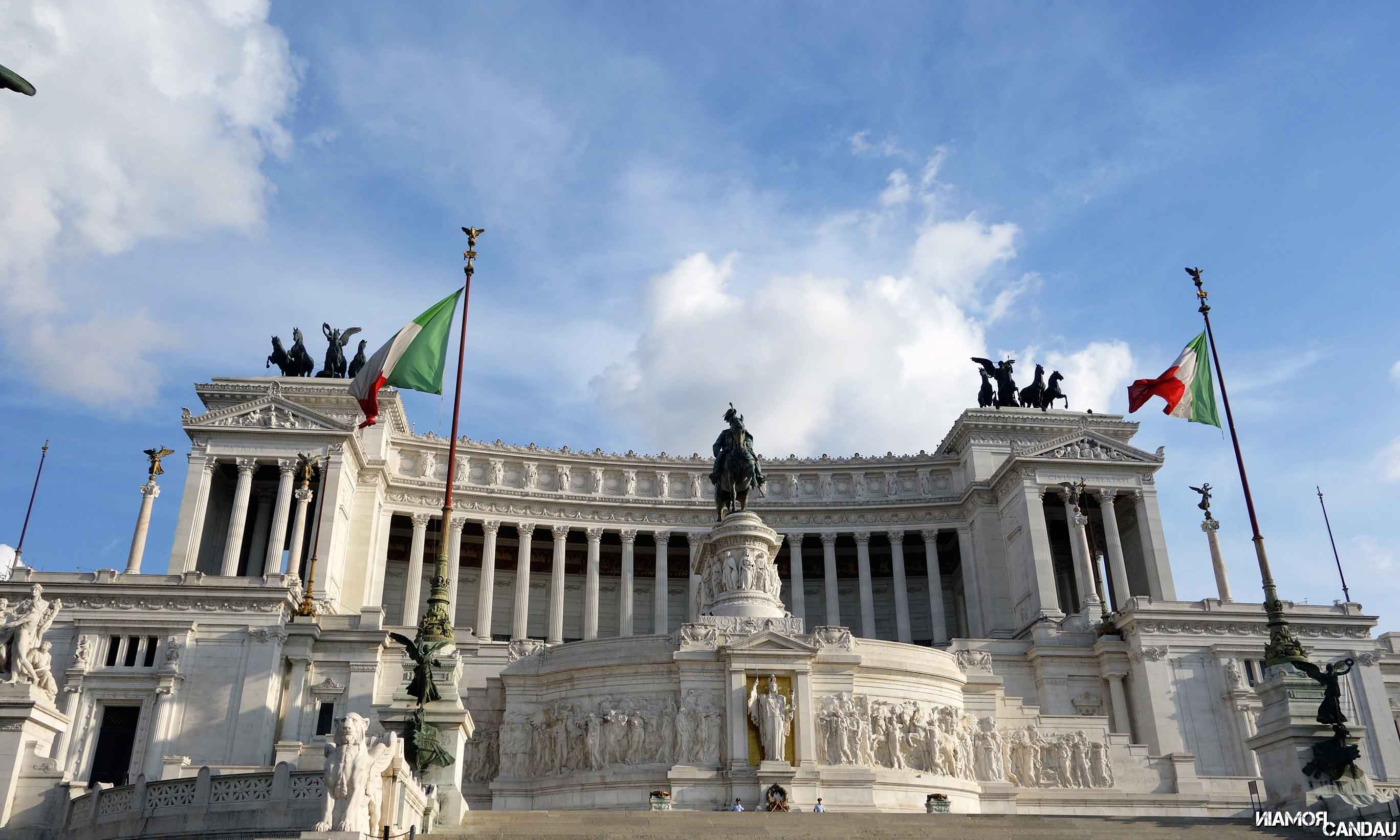 Après avoir longé le forum Romain et la route pavée menant au Colisée, nous tombons (on ne peut vraiment pas le louper) sur l’imposant monument à Victor-Emmanuel II (Vittoriano en VO). Ce palais est absolument gigantesque et on se sent réellement minuscules à côté.