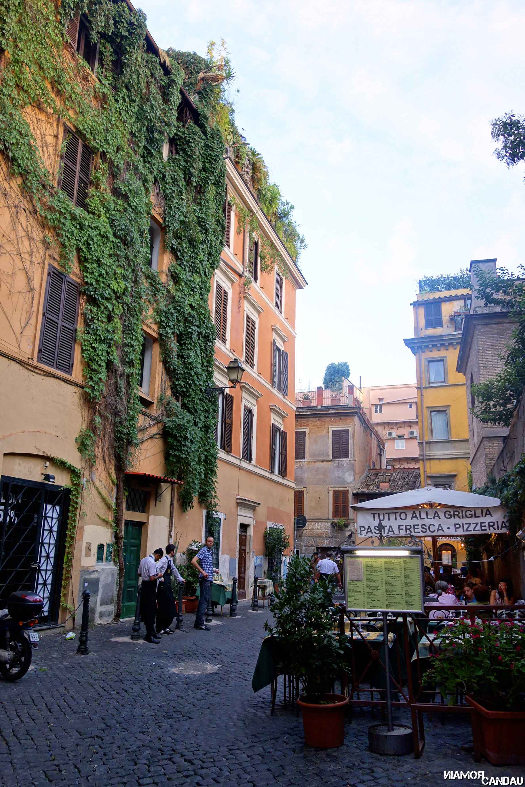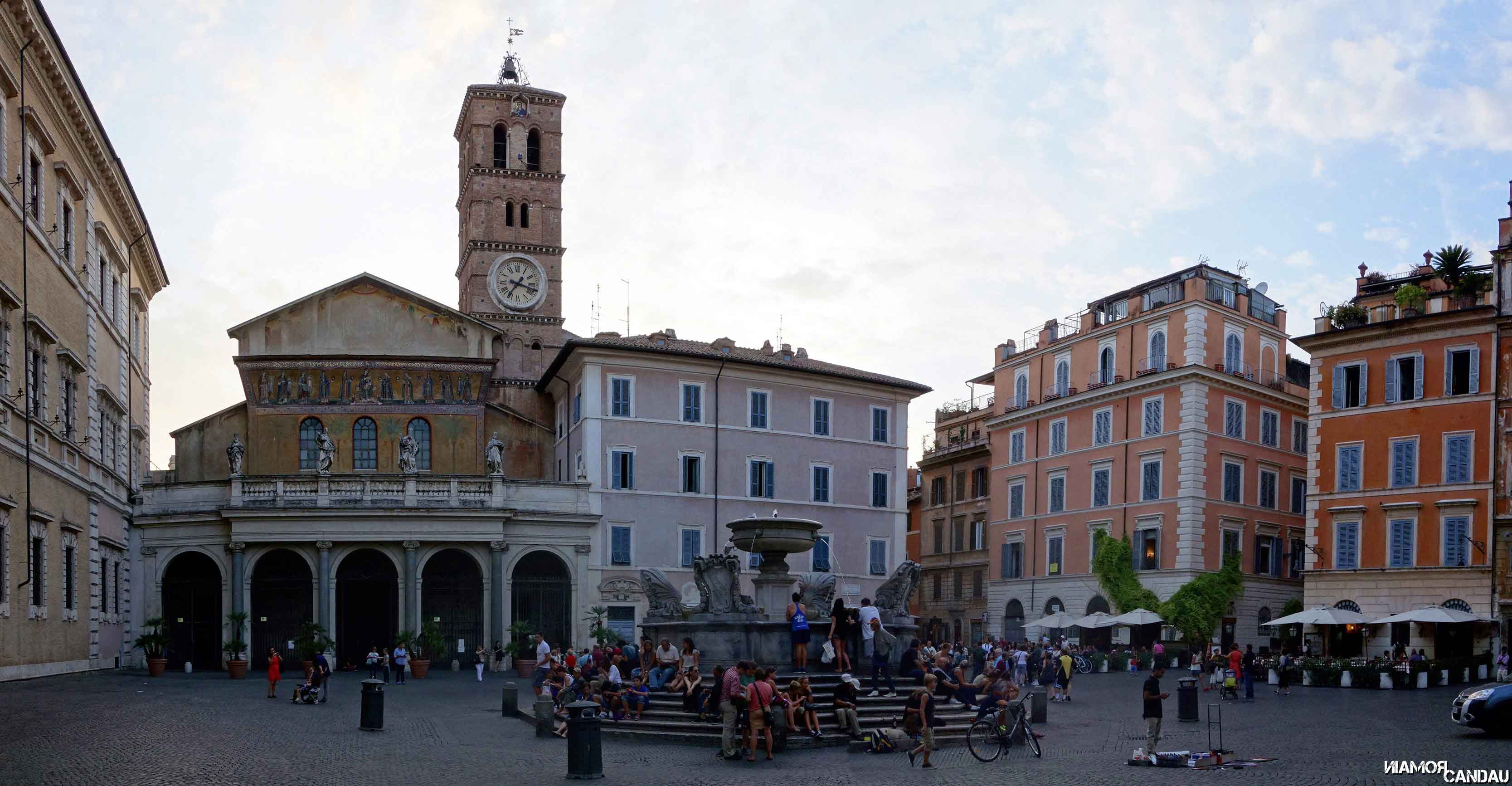 Le quartier du Trastavere a par contre beaucoup à offrir. C’est le quartier le plus authentique de Rome selon nous. La balade dans les rues pavées et colorées de ce charmant quartier fut très agréable. C’est vraiment un endroit propice à la flânerie. En marchant sans trop savoir où on allait, nous sommes tombés sur la magnifique place de l’église Santa-Maria-in-Trastevere.