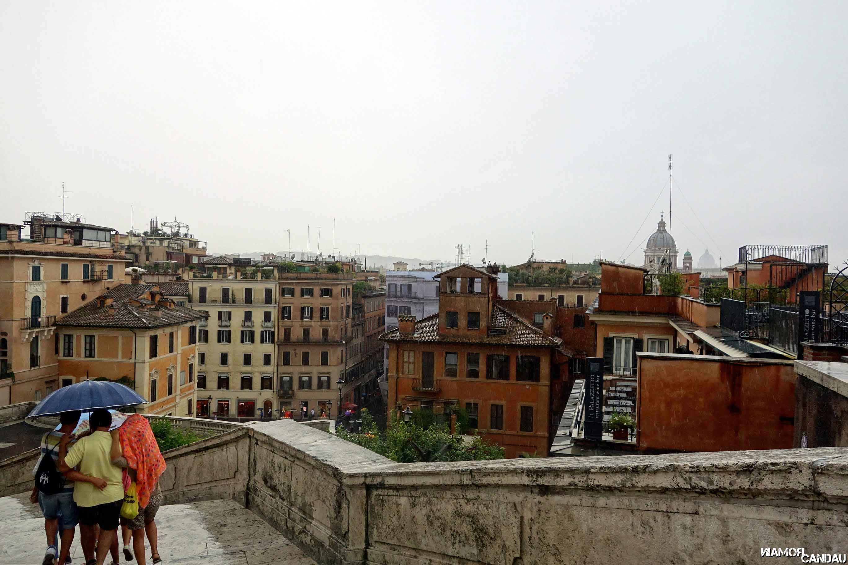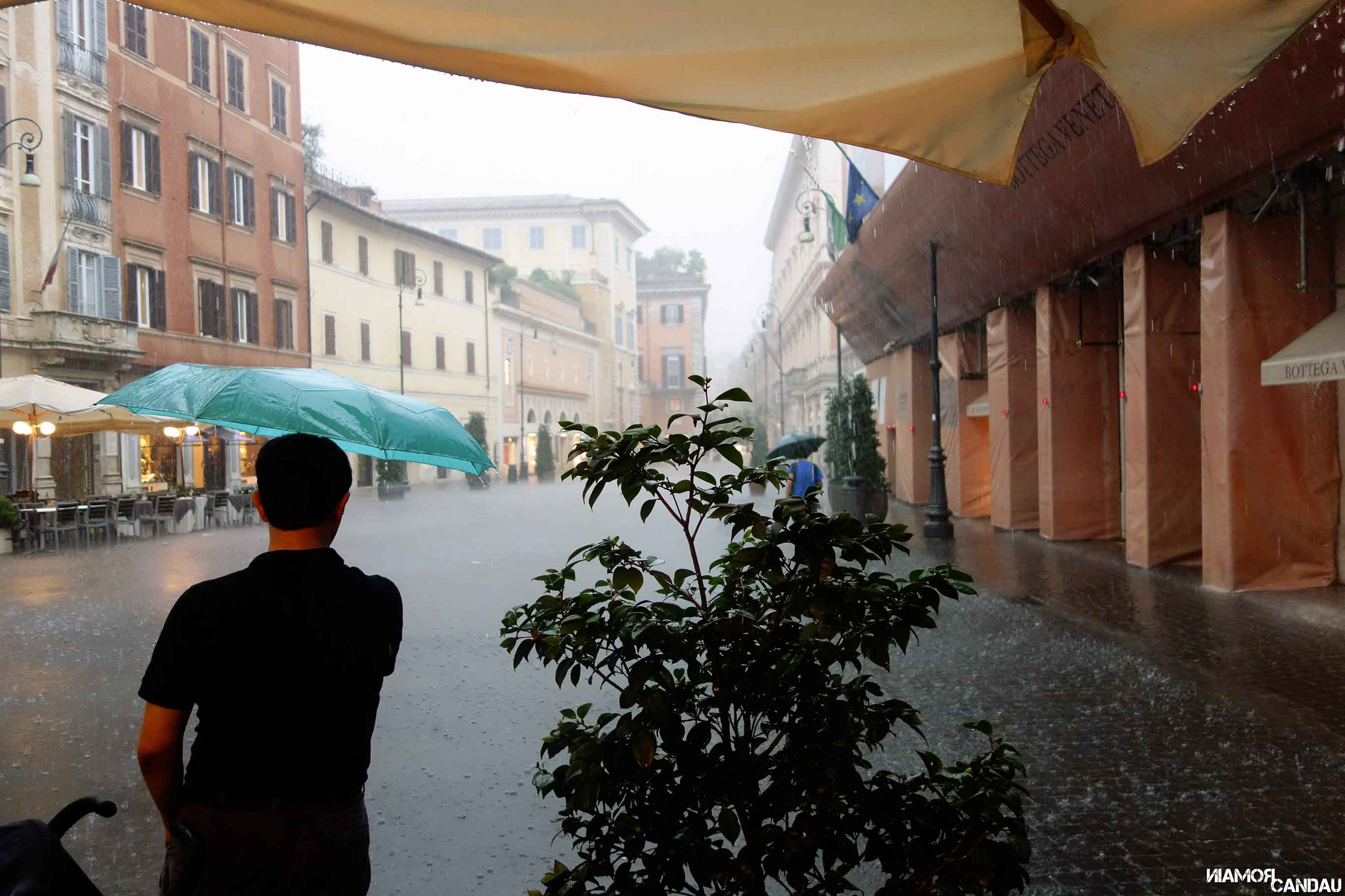 La visite du parc, galerie Borghese comprise, nous a pris la demi-journée. Nous avons ensuite marché vers le centre afin de trouver un restaurant pour manger alors que l’orage guettait au loin. Nous nous sommes installés dehors sur des tables abritées par des grands parasols (il faisait grand soleil !) quand l’orage éclata. Des trombes d’eau qui ont duré 2h ! Les parasols ont fait office de parapluie ! Si comme nous, vous tombez sur un orage et que vous n’avez pas pris de parapluie, pas de panique, c’est pas les vendeurs de parapluie à la sauvette qui manquent… Ils vous courent presque après pour vous convaincre d’acheter leur parapluie. Comme on se trempait la gueule, pas d’autre choix que d’en acheter !