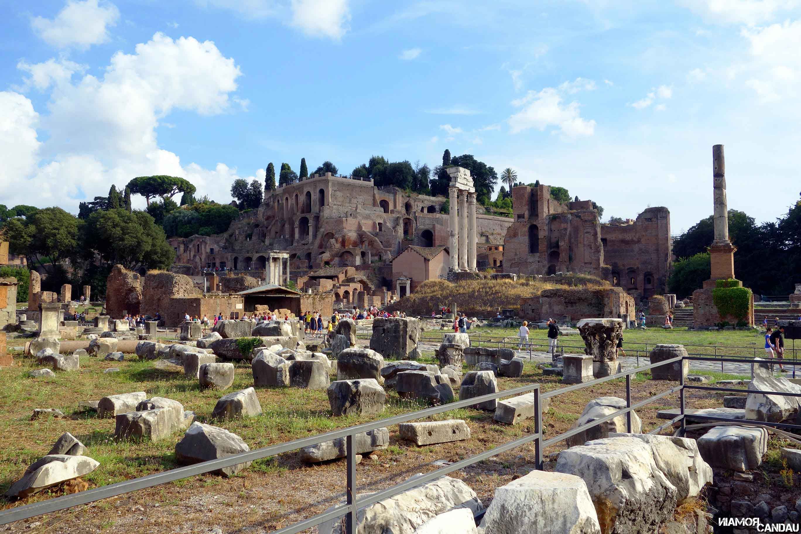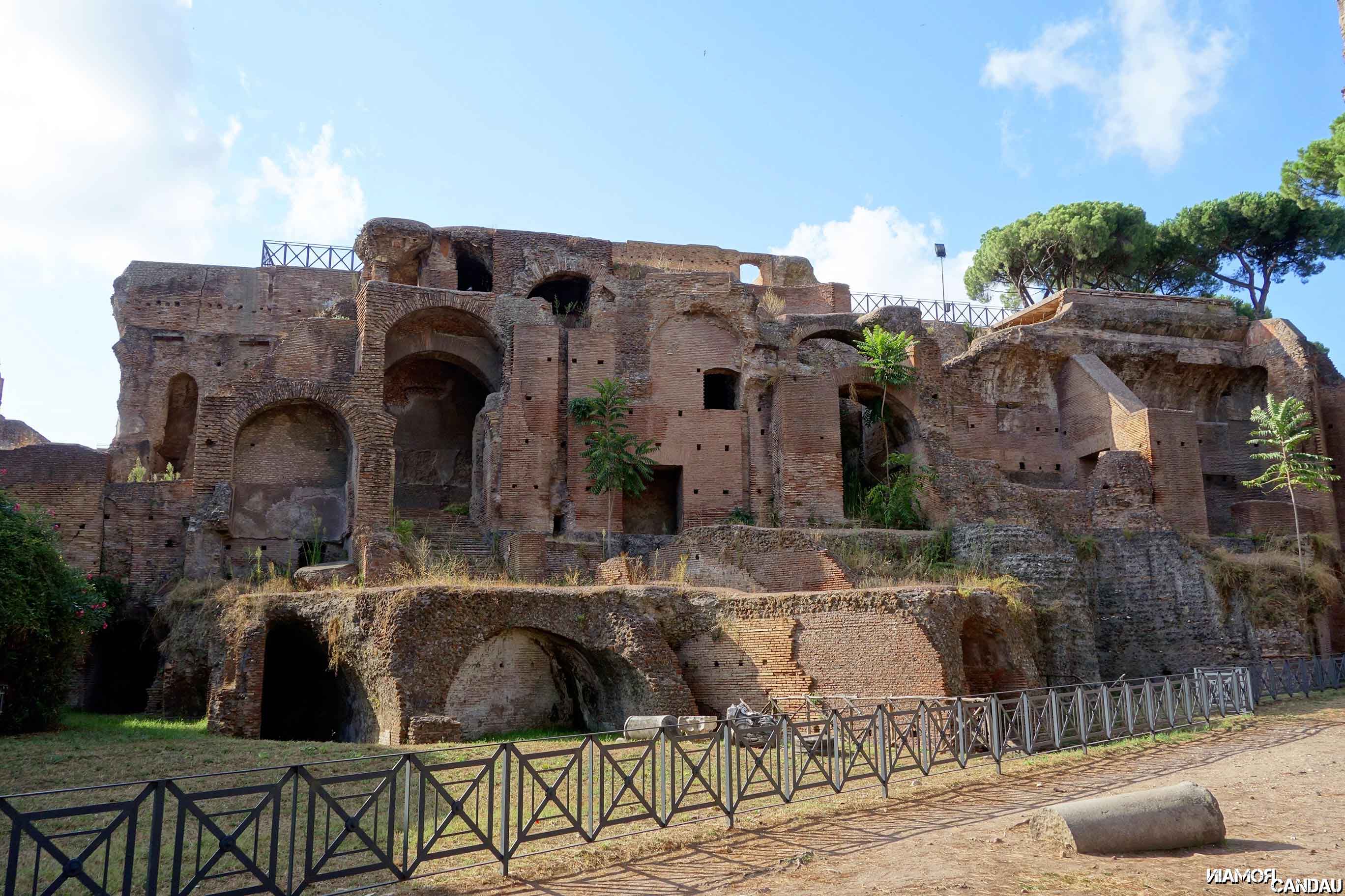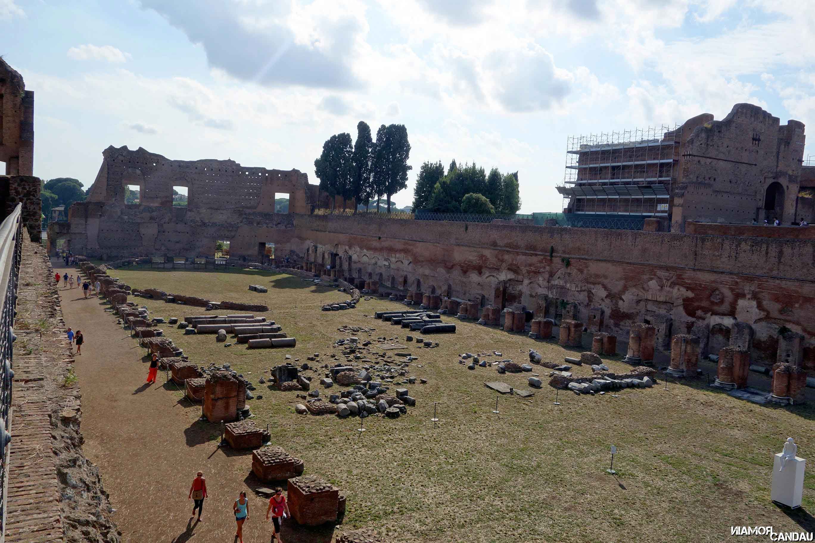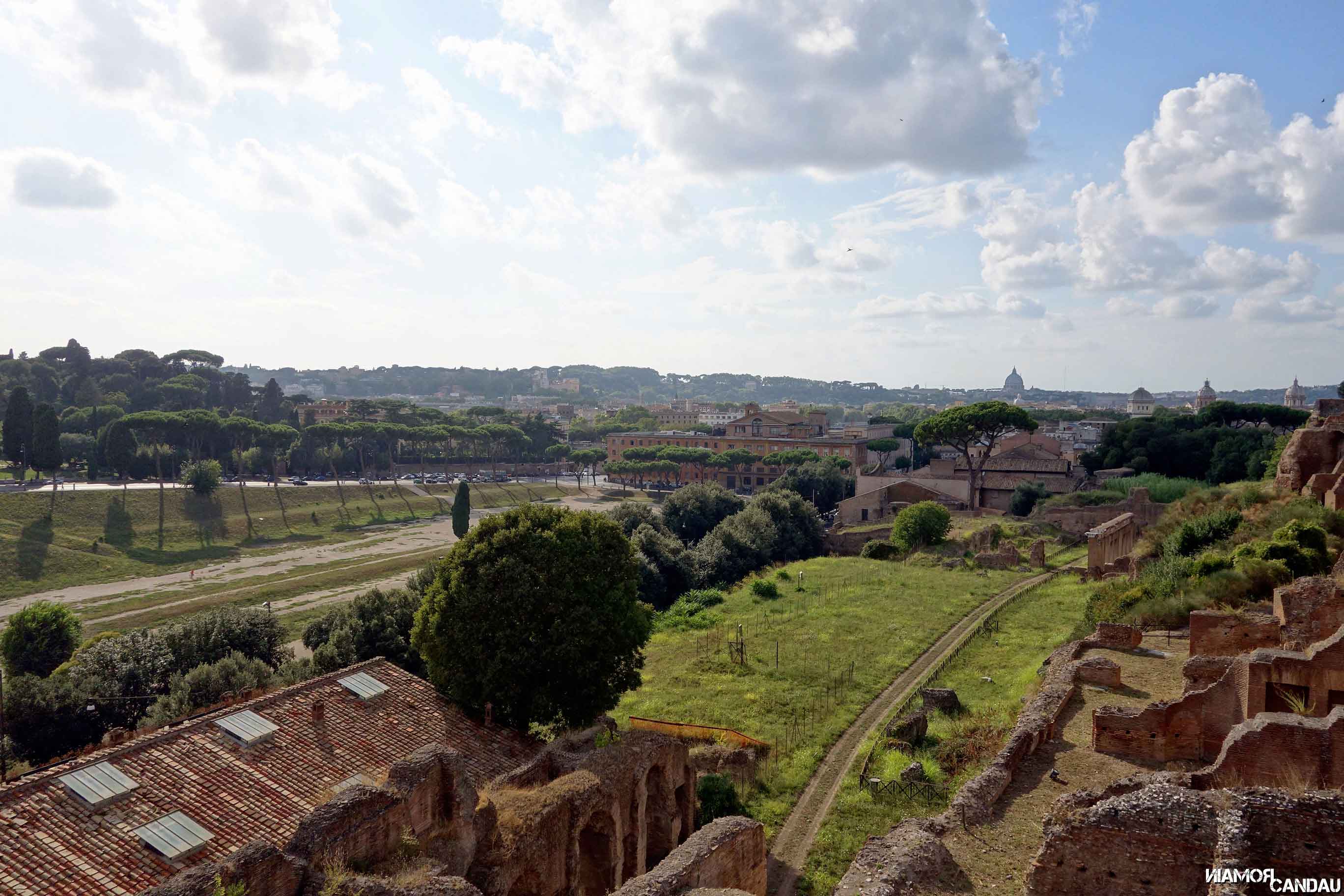Sur les hauteurs, un peu plus loin, se dresse le Palatin. La colline du Palatin est une des sept collines de Rome. La légende veut que Rome ait été fondée sur le Palatin. La colline fut habitée par des nobles et riches romains qui y construisirent leurs villas et leurs palais. Aujourd’hui il n’en reste que des ruines. Le Palatin est assez vaste et peut s’apparenter à un parc. Beaucoup de végétation et quelques bâtiments assez bien conservés. Le clou de la visite c’est bien sûr la vue exceptionnelle sur Rome, sur les thermes de Caracalla et sur ce qu’il reste du Cirque Maximus.