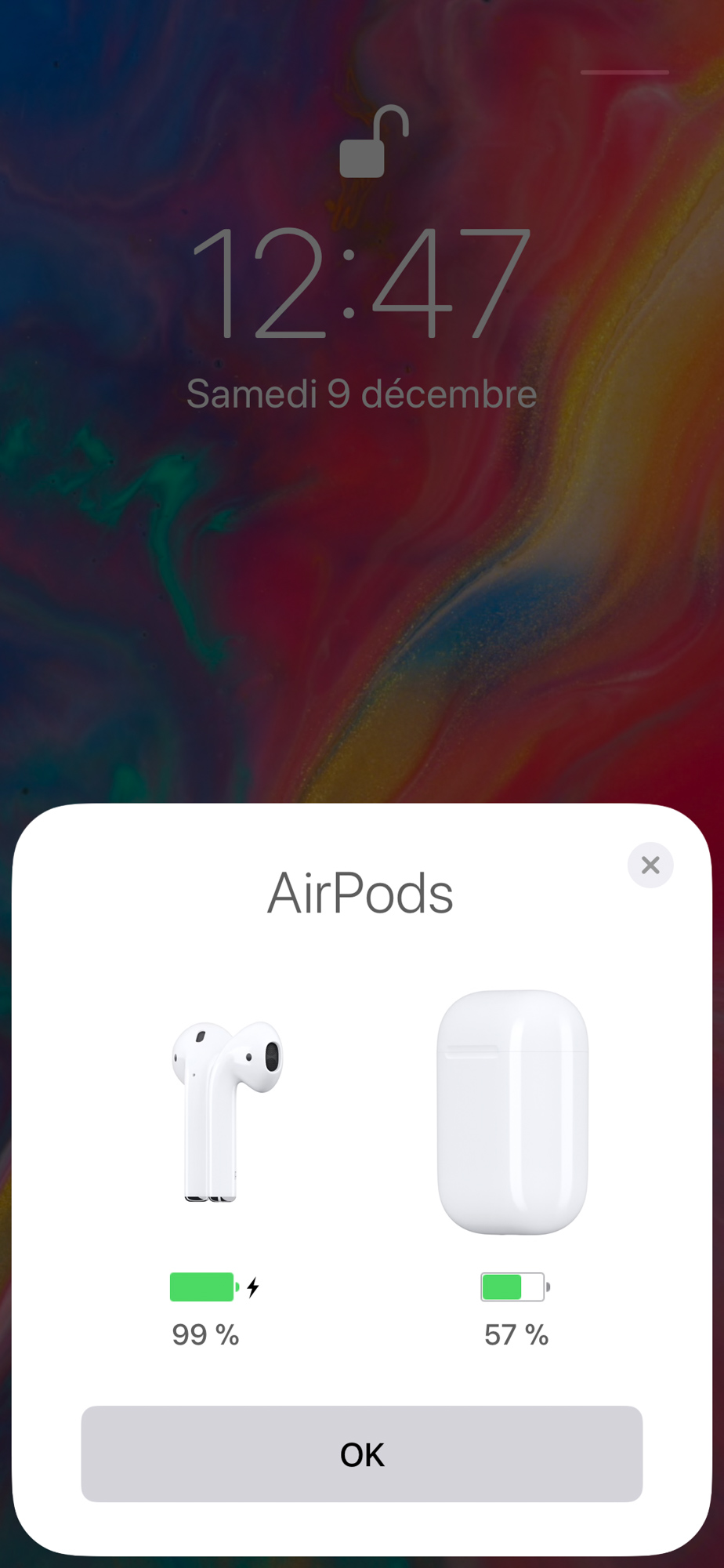 Une fois connectés à l’iPhone, les AirPods apparaissent dans le widget « Batterie » avec leur pourcentage de charge ainsi que celui du boîtier. Si les écouteurs ne présentent pas le même pourcentage de charge, le widget affichera 2 lignes, avec le pourcentage de charge de chaque écouteur.