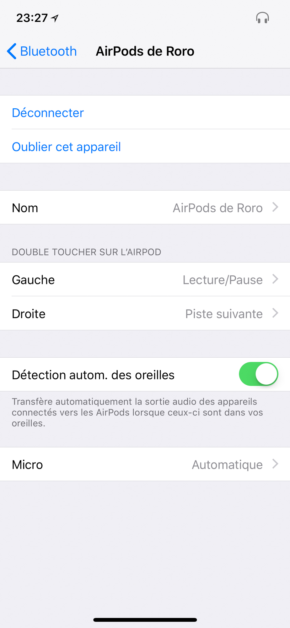 L’autre gros point fort des AirPods, en plus de switcher automatiquement entre mon Apple Watch et mon iPhone aussi simplement que bonjour, c’est qu’ils mettent la musique en pause dès que j’en retire au moins un de mes oreilles. Et la musique se remet en route dès que je les remets dans mes oreilles. Simple, mais magique ! Ça a l’air bête comme ça, mais franchement c’est top ! On peut également n’utiliser qu’un seul AirPod sur deux, ce qui peut être utile dans certains cas.