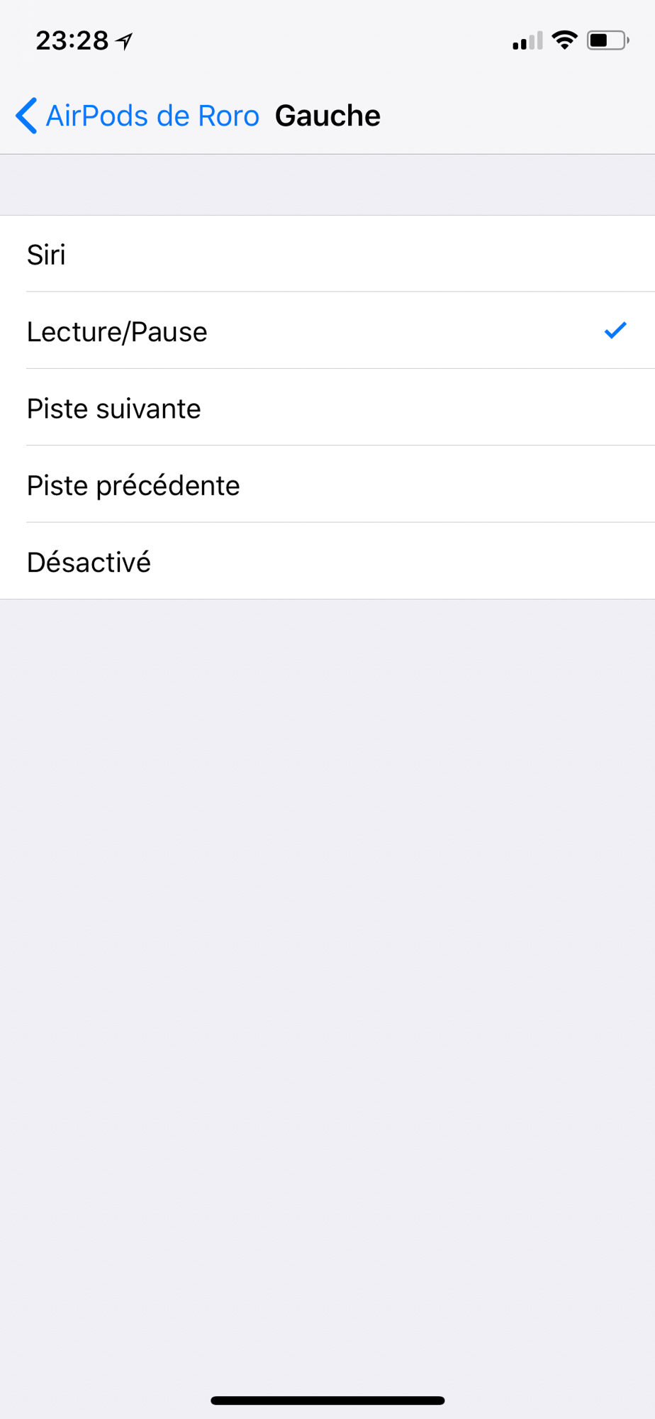 Voici les réglages qui peuvent être assignés indépendamment sur chaque AirPod :