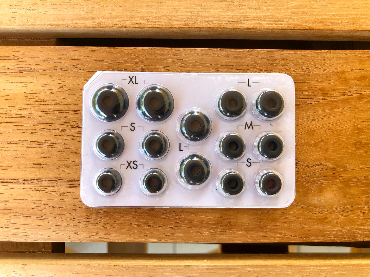 Un emballage cartonné contient les accessoires : le câble USB-C (très court, mais très bon point pour le format USB-C très pratique) permettant de recharger l’étui et une « plaquette » contenant pas moins de 7 embouts (en plus de ceux installés sur les écouteurs) de taille et de format différent (conique et parabolique/aplati).