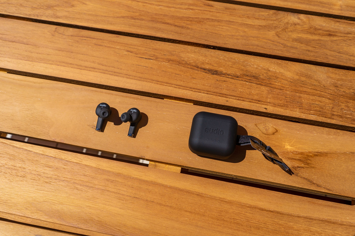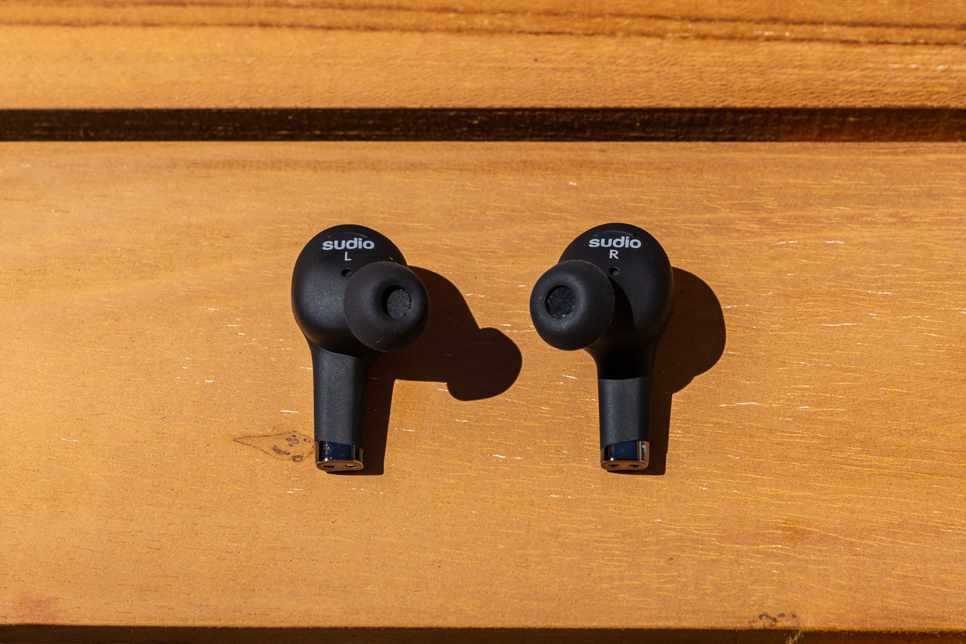 Les écouteurs font un peu plus massifs que sur les illustrations, ils sont très doux au toucher. Leur aspect mat les rend très élégants. Ils sont assez légers, 5 g chacun (en comparaison, 6 g pour les Jabra et 4 g pour les AirPods). Les Sudio ETT existent en 4 couleurs : noir, blanc, rose pâle et vert militaire. J’ai demandé à Sudio de me les envoyer en noir, c’est sobre, c’est passe-partout et ça les différencie de l’omniprésence du blanc des AirPods.