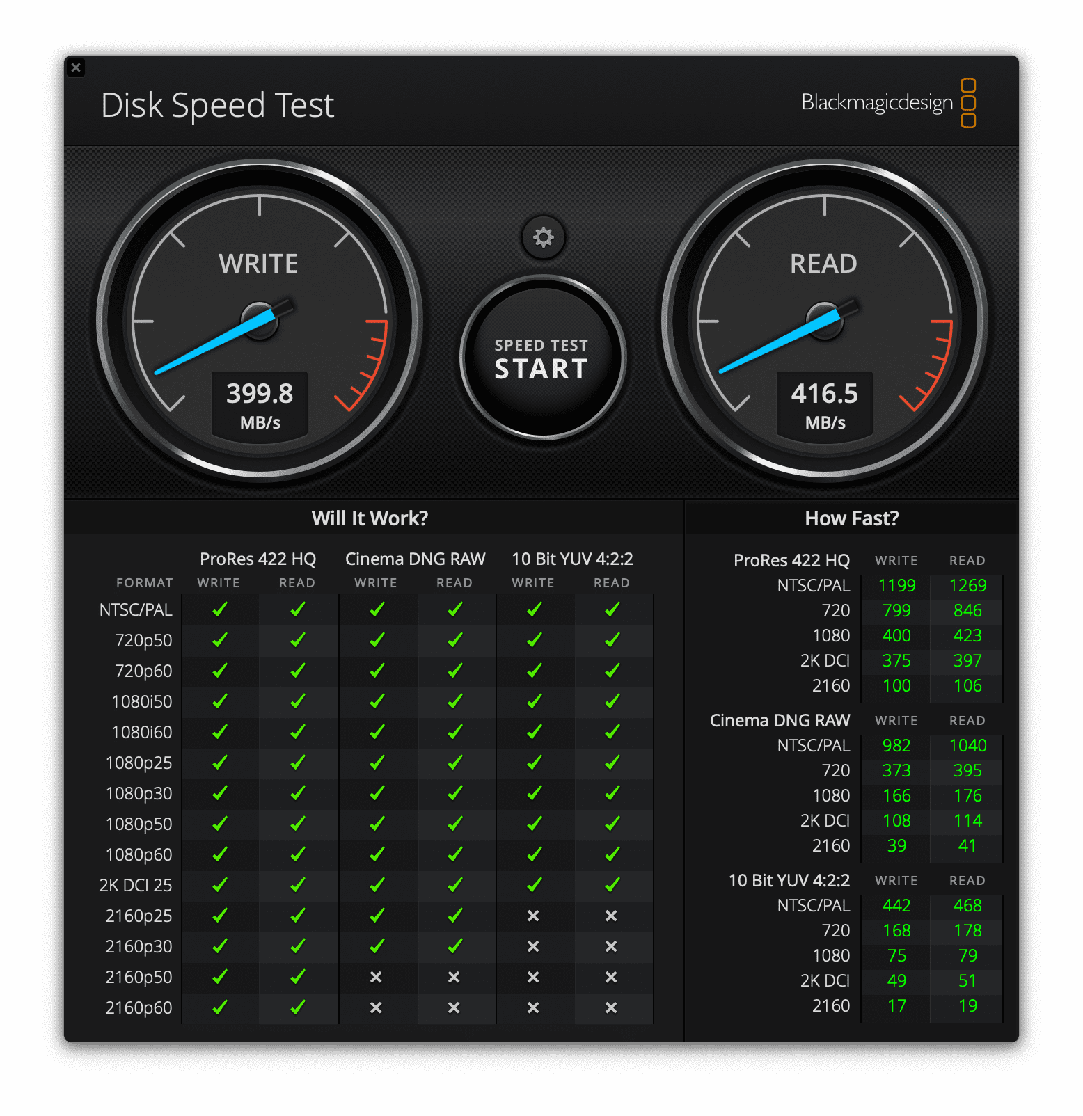 Les débits atteignent environ 400 Mb/s aussi bien en écriture qu’en lecture.