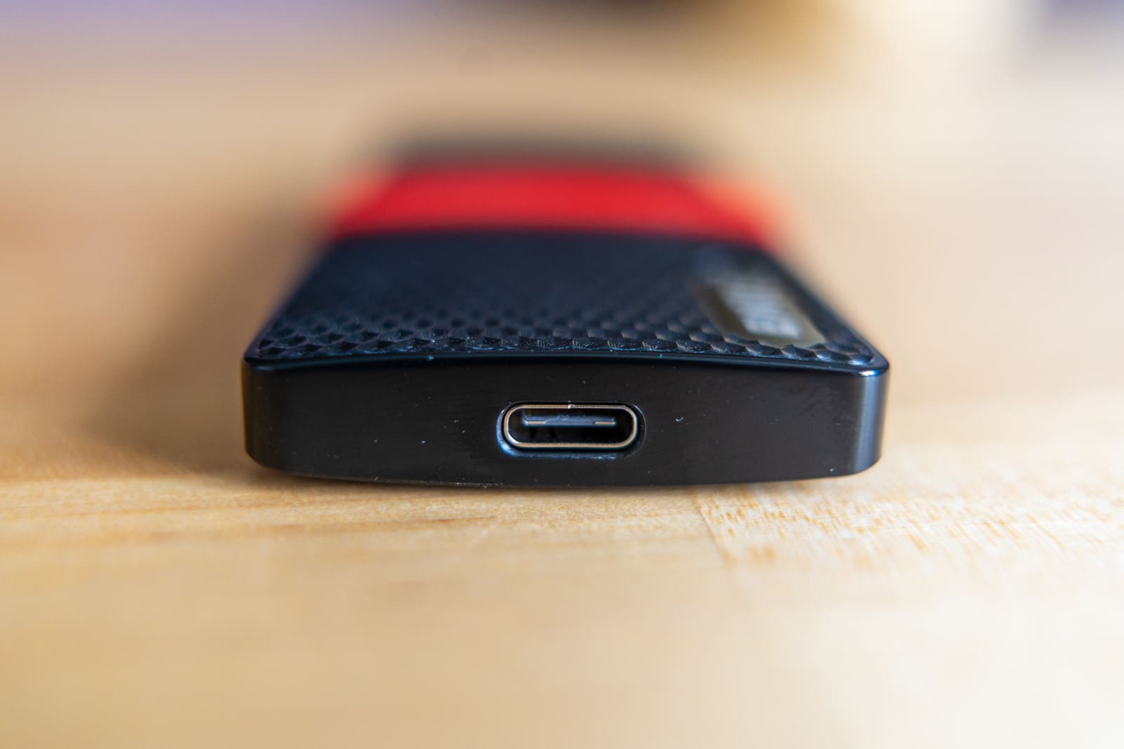Visuellement, le disque dur est plutôt joli avec sa face en nid d’abeille. Sur le dos, la présence de deux LED indique l’accès aux données en lecture ou écriture (LED clignotante) et la mise sous tension (LED fixe). Le boîtier est entouré d’un élastique rouge en caoutchouc qui permet de venir y attacher le câble USB-C. Il permet également d’augmenter l’adhérence du boîtier quand on le tient en main, bien aidé par la conception en nid d’abeille.