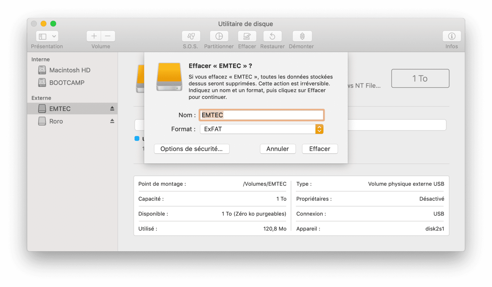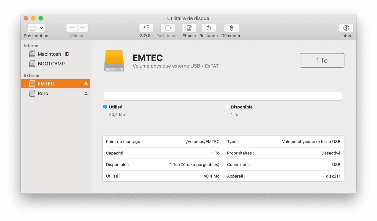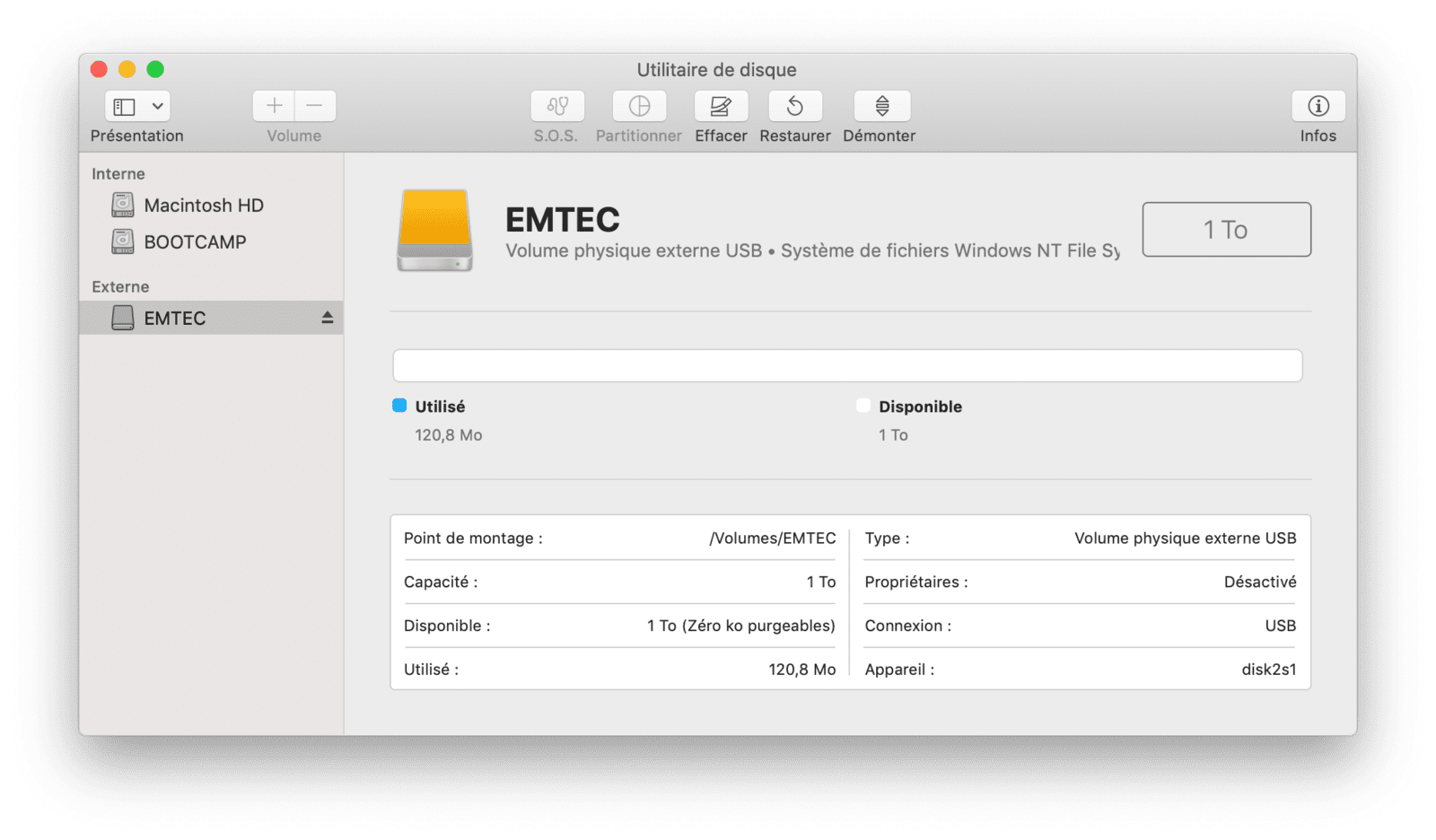 Par défaut, le disque dur est formaté dans le système NTFS et sous MacOS, le NTFS est géré uniquement en lecture, je ne peux donc rien écrire sur le disque dur. Je l’ai donc reformaté en exFat pour pouvoir écrire dessus. La décision de le vendre en NTFS se justifie parfaitement puisque Windows est archimajoritaire sur le marché. Mais du coup, ce X200 ne fonctionnera pas totalement en sortie de boîte avec le système MacOS.