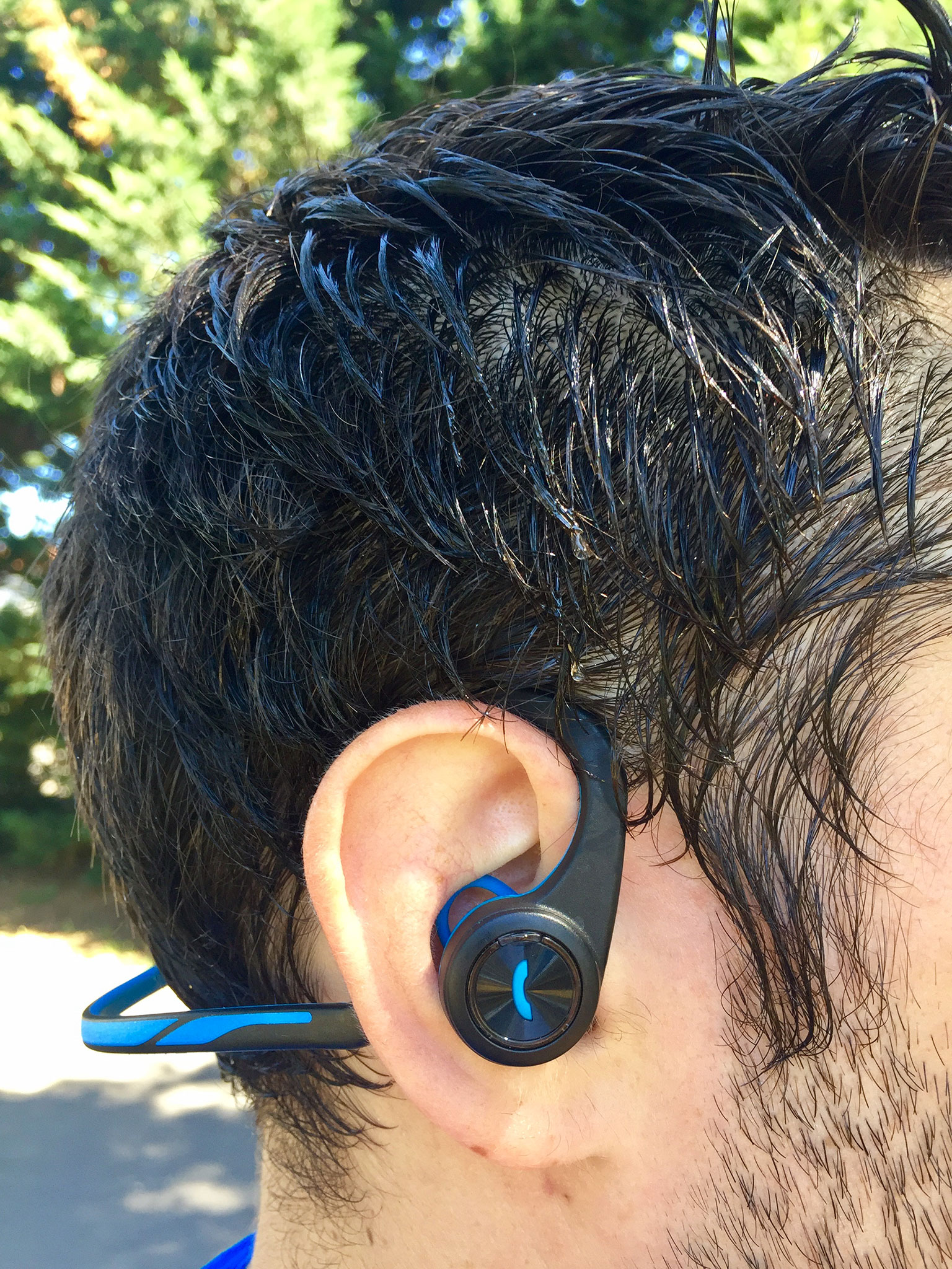 Dès les premières minutes, j’ai été complètement rassuré sur la tenue et le confort du truc ! Rien ne bouge, c’est assez bluffant. Je me suis filmé en courant pour voir comment réagissait l’arceau et en fait il bouge pas mal mais on le sent vraiment pas du tout, j’étais vraiment persuadé qu’il bougeait pas d’un iota pendant que je courais. Au niveau des oreilles, rien ne bouge non plus ou presque, ça m’est arrivé de les toucher pour les recaler les premières fois mais ils sont loin de sortir de l’oreille, n’ayez crainte. Quel bonheur de ne plus entendre tous les défauts des intras (sensation de bouchon d’oreille, pas qui résonnent…) pendant la course, j’oublie complètement que je cours avec des écouteurs.